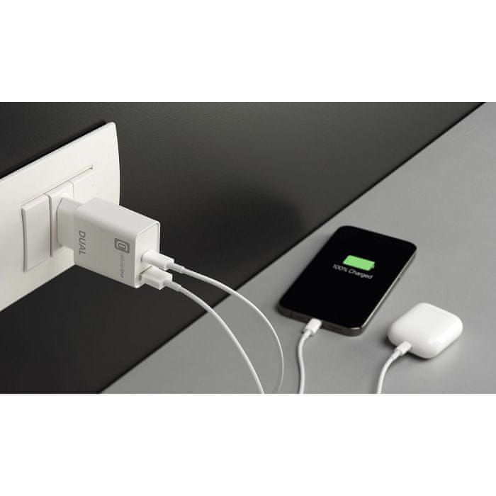 ACHIPHUSB2PD20WW je hišni polnilec (20W), z dvojnim vhodom (USB in USB-C) in tehnologijo Power Delivery, ki omogoča hitro polnjenje telefonov znamke Apple.