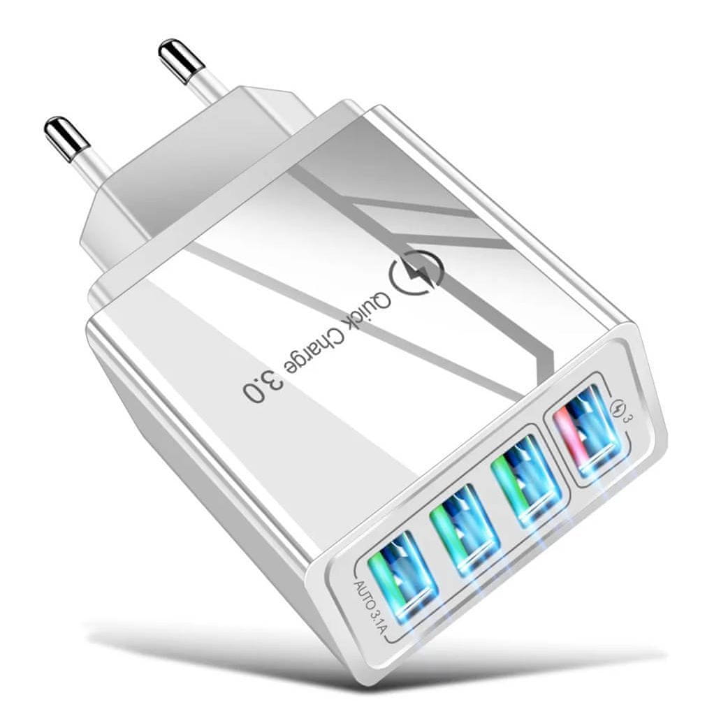 Mrežni polnilec – 4× USB vhod, moč 48W, inteligentno hitro polnjenje, izhod 5V / 3A (maks.), prenapetostna zaščita. Bulk paket. Celoten opis