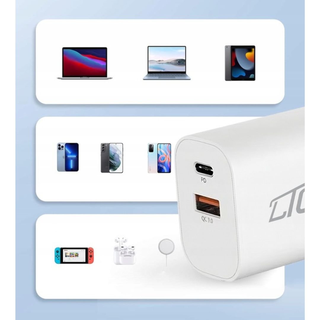 Zahvaljujoč priključkoma USB-C in USB-A, polnilec podpira tako rekoč vse naprave – od najnovejših pametnih telefonov do starejših modelov. Popoln za hkratno polnjenje pametnih telefonov, tablic, prenosnikov, slušalk, pametnih ur in drugih naprav. Priročno in učinkovito upravljanje z energijo!VISOKA MOČ 20 W