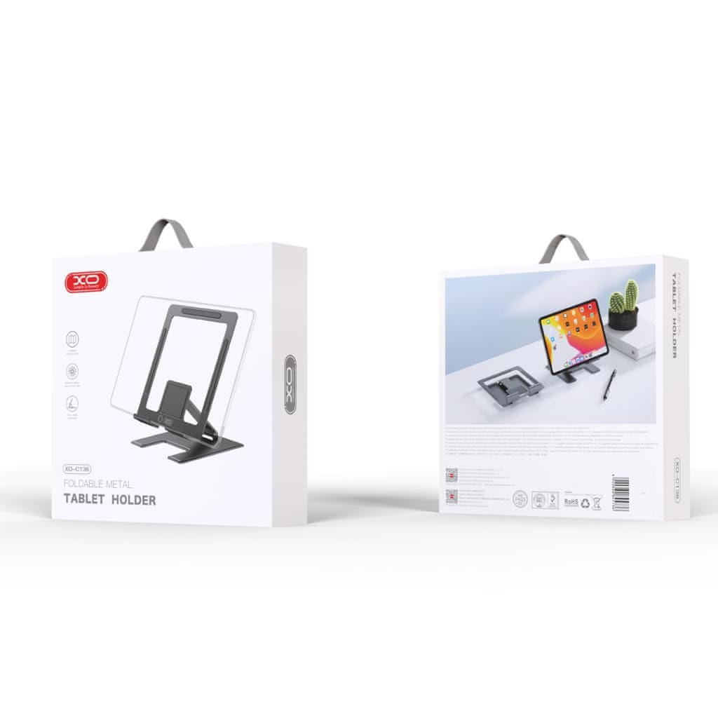 XO C136 je univerzalni nosilec za tablico. Premična glava omogoča, da stojalo zložite in tablico nastavite pod različnimi koti in višinami.