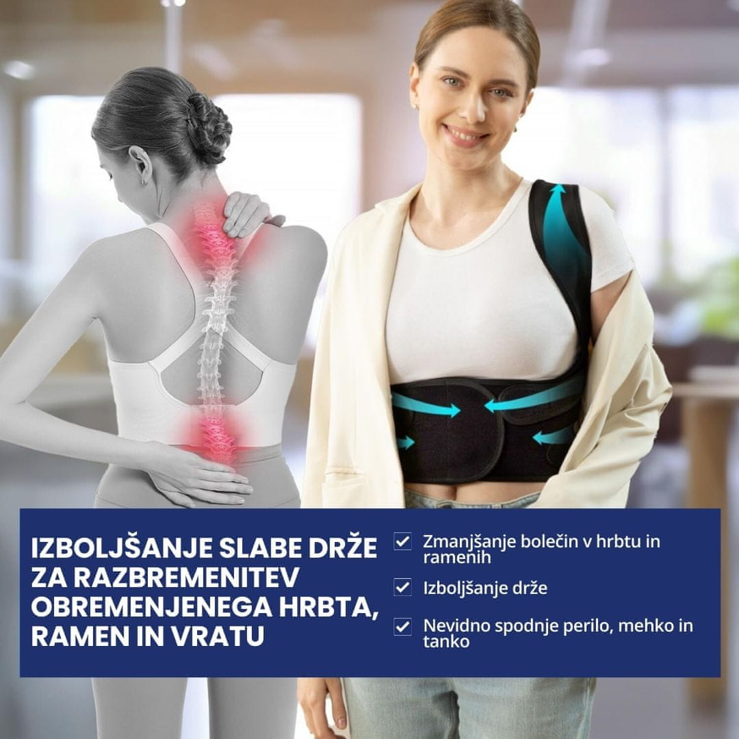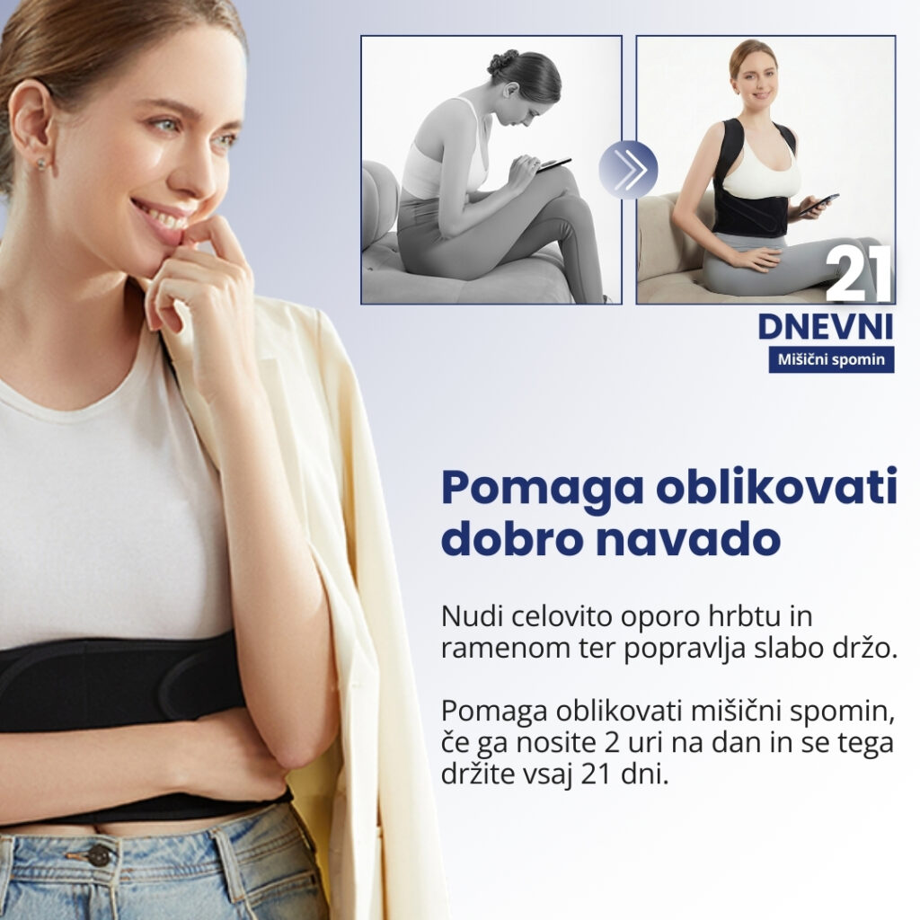 Elastičen ojačitveni trak dodatno podpira pas, medtem ko ergonomska zasnova omogoča naravno gibanje in učinkovito korekcijo drže.