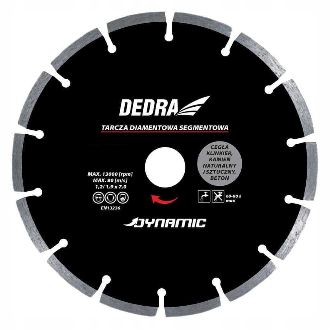 DINAMIČNI DEDRA SEGMENTIRANI DIAMANTNI DISK ZA PLOŠČICE 350 mm x 25,4 mm 350 mm / 25,4 mm Rezalni disk za: opeko, klinker, naravni kamen, umetni kamen, beton. Značilnosti: Možno mokro delo Možno suho delo Uporabljen diamantni premaz Tehnični podatki: Premer diska: 350 mm Premer izvrtine: 25,4 mm Teža: 1,7 kg Ilustrativna slika, videz diska se razlikuje glede na premer diska. DEDRA je priznan proizvajalec orodij, ki na poljskem trgu deluje od leta 1991. Izdelke blagovne znamke DEDRA odlikujeta visoka kakovost in zanesljivost.