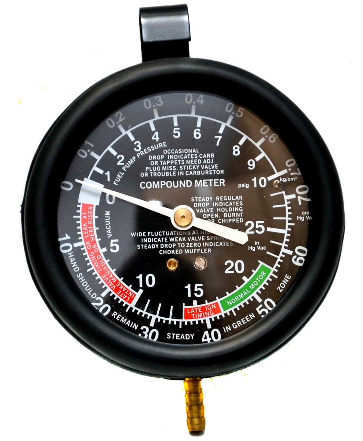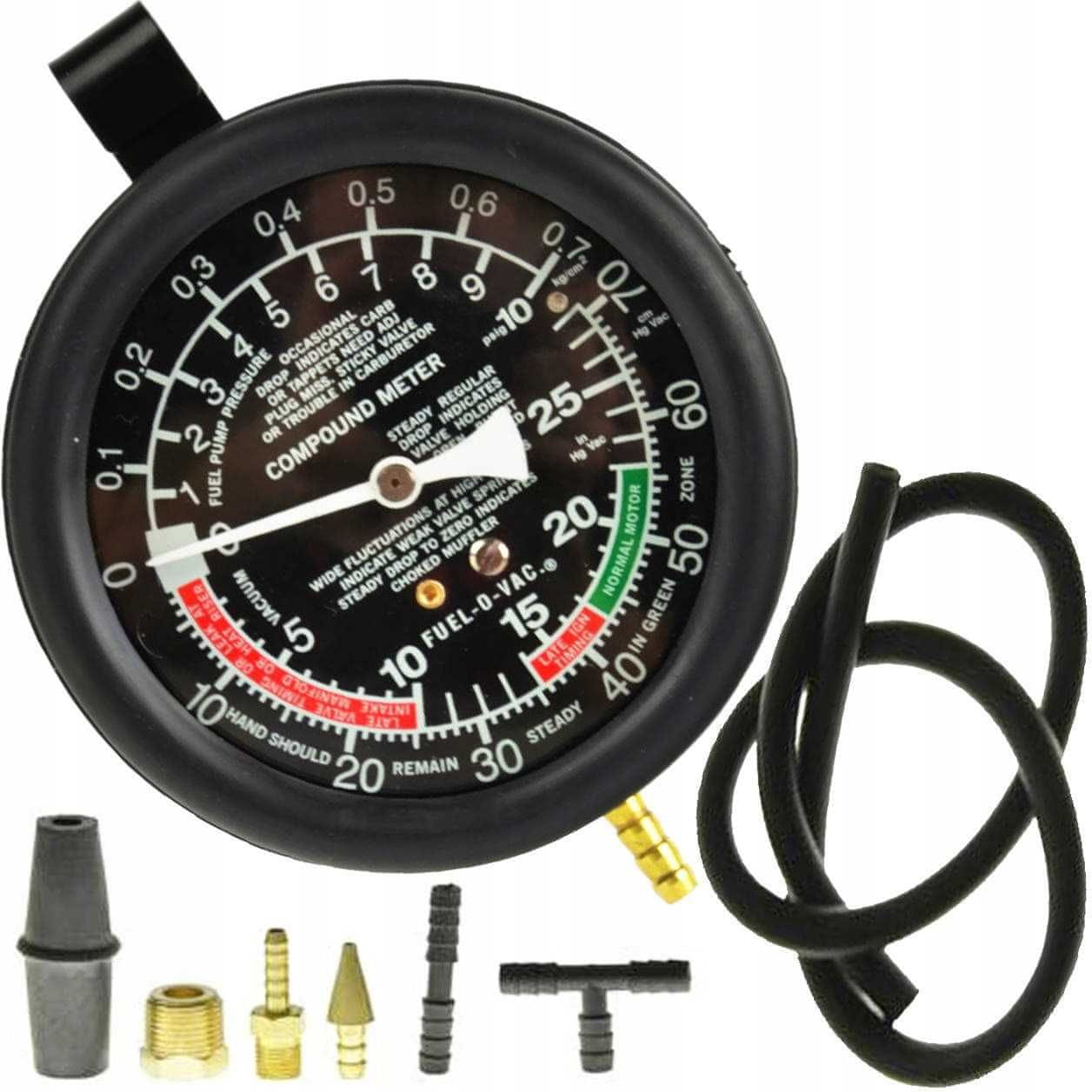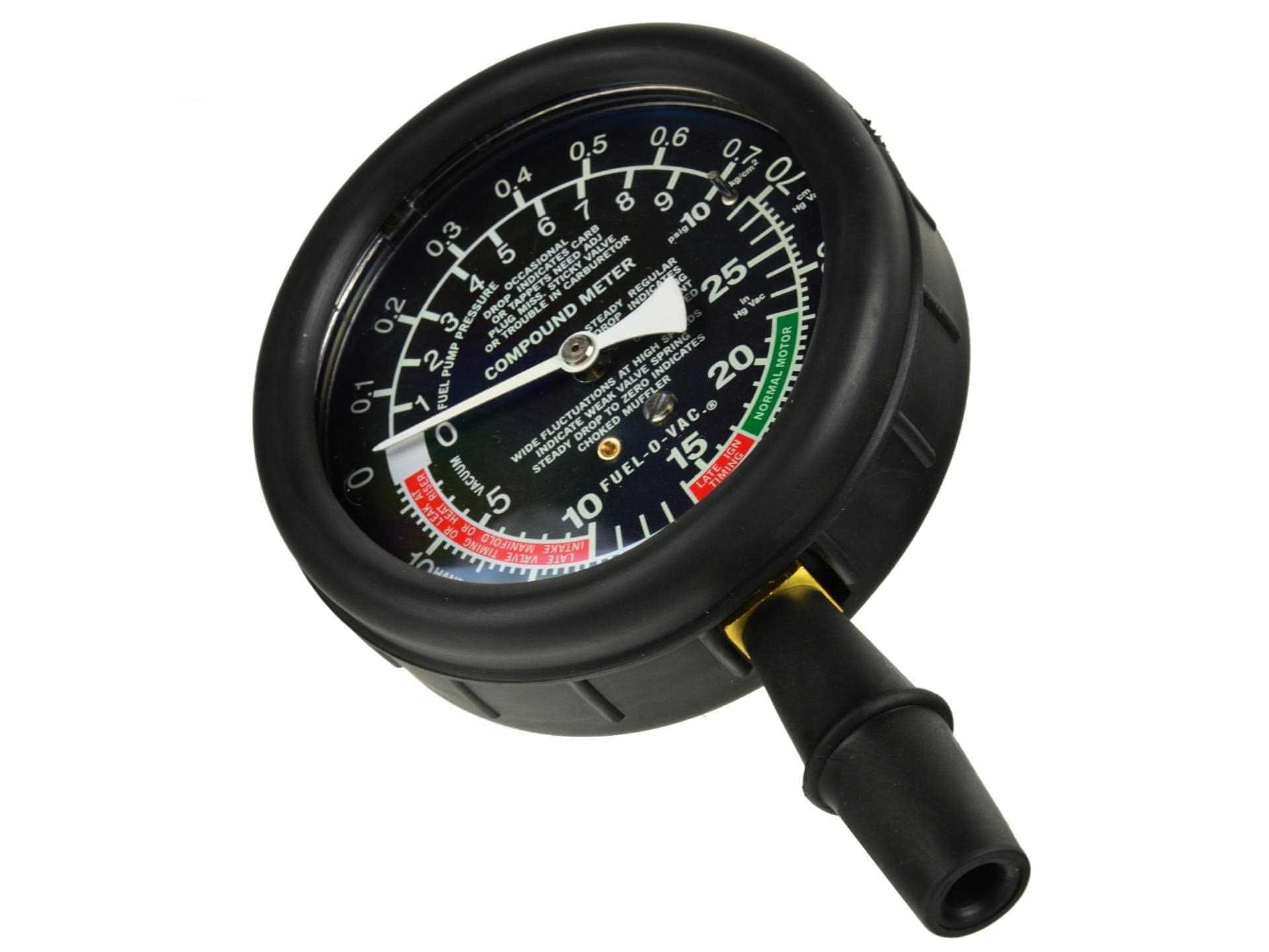 GEKO G02508 VAKUUMSKI TESTER TLAKA. Ta tester se uporablja za merjenje tlaka in vakuuma v sistemih za gorivo. Primeren je za tlačne in vakuumske preizkuse mehanskih in električnih črpalk za gorivo. Uporablja se lahko tudi za merjenje zavornih sistemov in odkrivanje puščanja injektorjev in črpalk za gorivo. Uporablja se lahko tudi za servo sisteme, meritve vakuuma v uplinjačih in sesalnih kolektorjih, servo volanu in zavornih sistemih, solenoidnih ventilih, elektrovakuumskih ventilih in diagnostiko ventilov. Tehnični podatki: – Merilno območje manometra: 0 do 0,7 kg/cm2 (0 do 0,68 bar) 0–10 psi g – Merilno območje vakuumskega manometra: 0 do –27,5 In Hg / 0 do –70 Cm Hg (0 do –0,93 bar) – Manometer: premer 3,5" – Skalnica: 0,05 bar – Dolžina cevi: 0,6 m