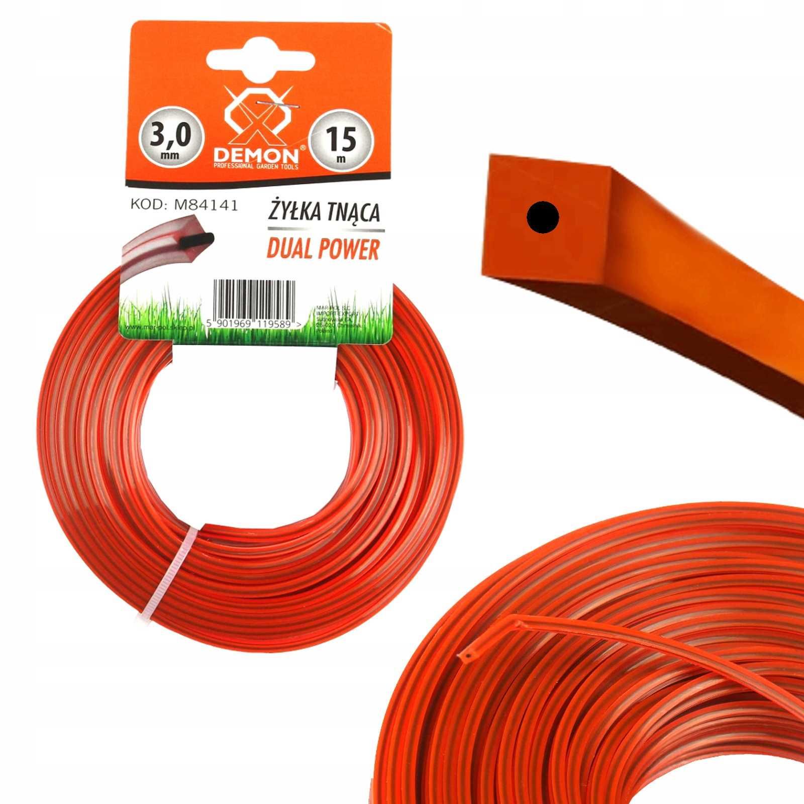 DEMON OJAČANA KVADRATNA KOSILNA NIT ZA KOSILNICE IN KOSE 3,0 mm 15 m Profesionalna rezalna nitka DEMON DUAL POWER, zasnovana za kosilnice in električne ali bencinske kosilnice. Kakovost materiala omogoča košnjo več sezon. Je zelo odporna na udarce s trdimi predmeti. Nit je fleksibilna – občutljiva na znatno silo nihanja. Oblika ji daje večjo vzdržljivost pri zelo visokih vrtljajih, ostri robovi profila pa omogočajo enostavno upravljanje. Tehnične specifikacije: Dolžina: 15 m Presek: kvadraten Premer nitke: 3,0 mm Namen uporabe: univerzalen Tip: zvit, ojačan (ojačana) Namen uporabe: za kosilnice in kosilnice Rezalne nitke so močne, ostanejo dolgo fleksibilne in odporne na visoke temperature.