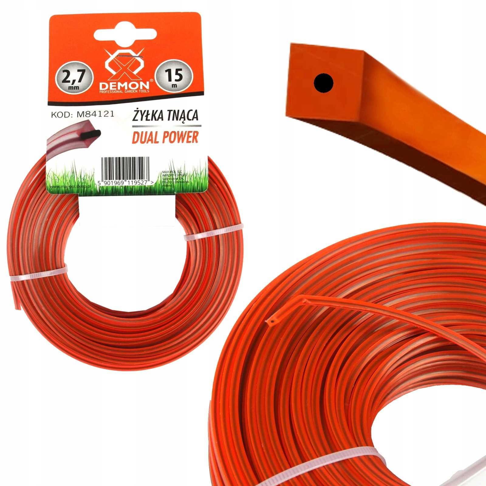 DEMON OJAČANA KVADRATNA NIT ZA KOSILNICO 2,7 mm 15 m Profesionalna rezalna nitka DEMON DUAL POWER, zasnovana za kose grmovja in električne ali bencinske kosilnice. Kakovost materiala omogoča košnjo več sezon. Je zelo odporna na udarce s trdimi predmeti. Nit je fleksibilna – občutljiva na znatno silo nihanja. Oblika ji daje večjo vzdržljivost pri zelo visokih vrtljajih, ostri robovi profila pa omogočajo enostavno upravljanje. Tehnične specifikacije: Dolžina: 15 m Presek: kvadraten Premer nitke: 2,7 mm Namen uporabe: univerzalna Tip: zvita, ojačana (ojačana) Namen uporabe: za kose grmovja in kosilnice Rezalne nitke so močne, ostanejo dolgo fleksibilne in odporne na visoke temperature.