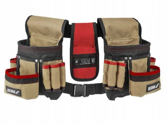 DEDRA MONTAŽNI PAS ZA ORODJE 3-delni pas za orodje N0033 je neverjetno uporaben za gradbena, zaključna, montažna in DIY projekte. Omogoča vam, da imate vsa potrebna orodja in materiale pri roki. In prostora je veliko, saj ima pas 16 žepov, 2 predelka, velik zunanji žep za žeblje, vijake ali druge manjše predmete, pa tudi zanke za kladivo in ločeno torbico za merilne trakove. Pas DEDRA je izdelan iz trpežnega poliestra 600D. Poleg tega so območja, ki so še posebej občutljiva na trganje in poškodbe, ojačana z jeklenimi zakovicami. Za večje udobje je mogoče dolžino pasu nastaviti. Značilnosti izdelka: Veliko število žepov – zahvaljujoč njim imate lahko s seboj vsa potrebna orodja in materiale Številne možnosti uporabe – za profesionalno in ljubiteljsko uporabo Trden material – odporen proti obrabi Ojačitev z zakovicami – tudi med intenzivno uporabo so najpomembnejša mesta zaščitena Tehnični podatki: Material: 600D poliester Velikost: 20×10×28cm x2 Nastavitev dolžine: da Ojačitev z zakovicami: da Število žepov: 16 Število predalov: 2 Zanka za kladivo: da