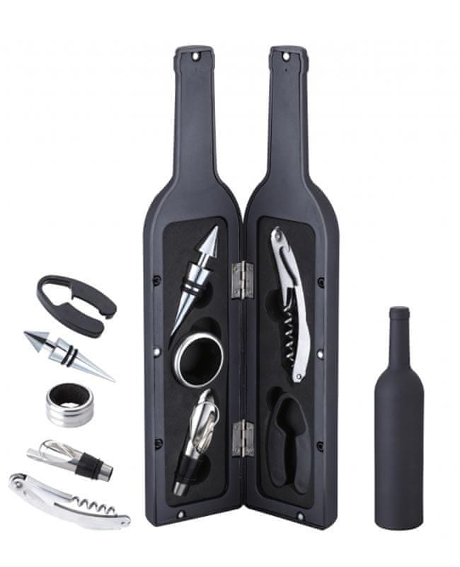 Komplet vinskih pripomočkov v ohišju v obliki zložljive steklenice.