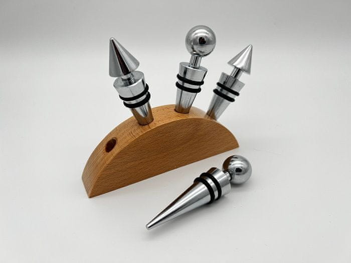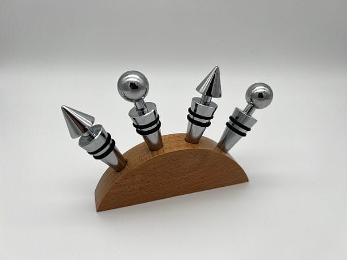Kaj dobite: paketu je priloženih 4 kosov zamaškov za steklenice vina iz jekla, ter praktično leseno stojalo.