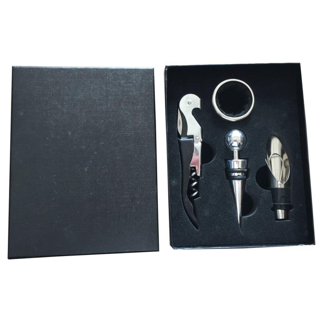 Štiridelni komplet vsebuje odpirač za steklenice z izvijačem in nožem, pokrovček za steklenice, obroček za vrat steklenice in lijak. Pakirano v darilni škatli.