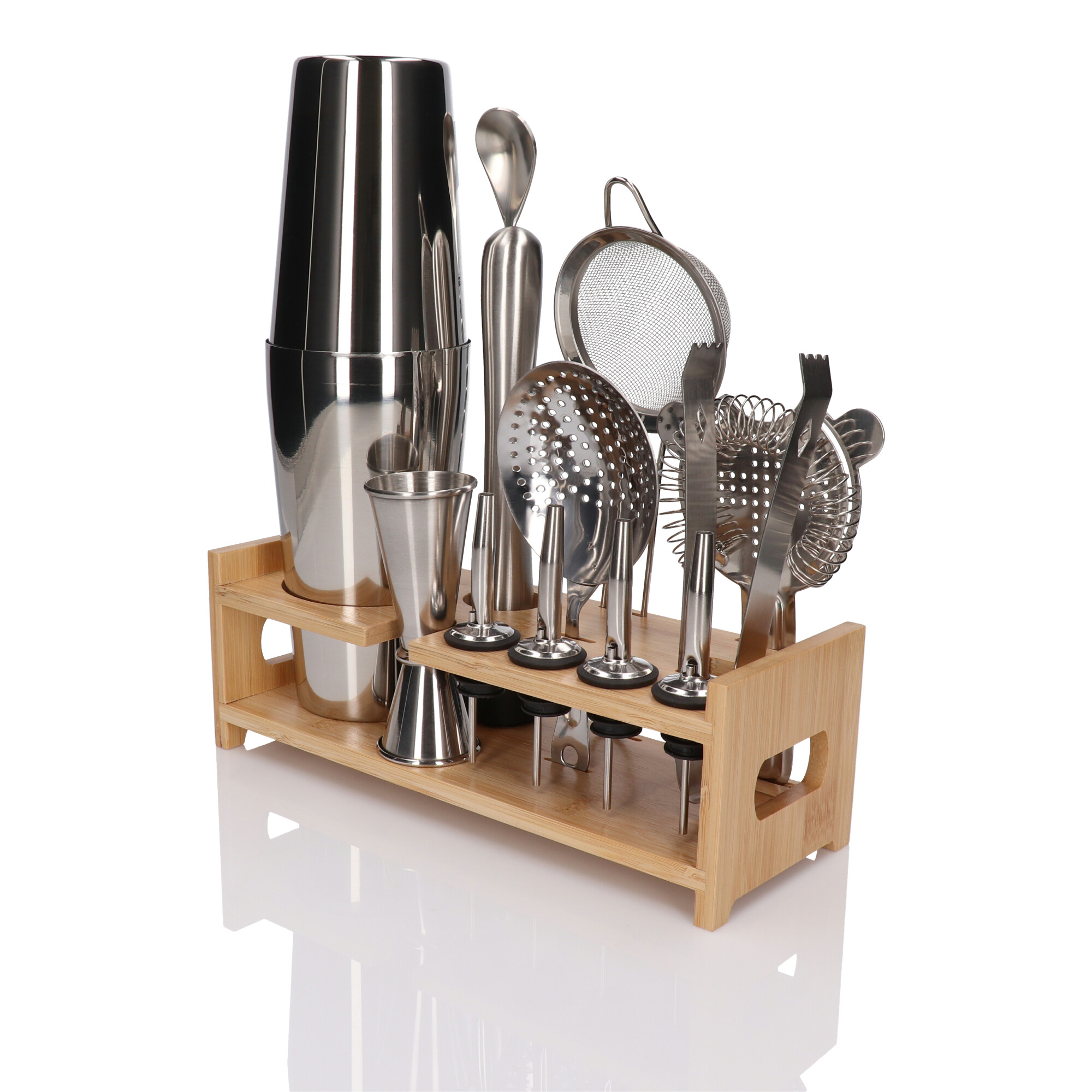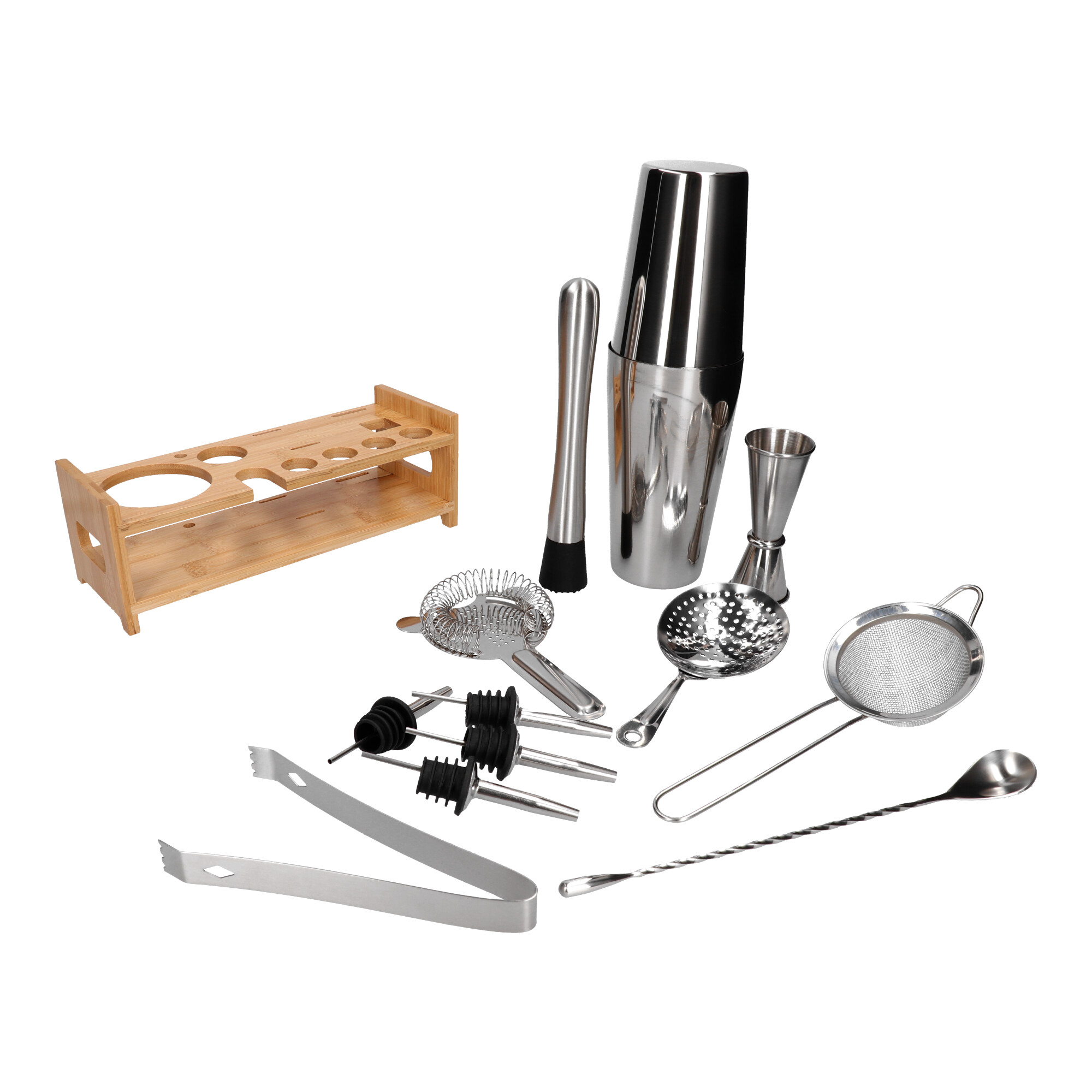 Profesionalni natakarski set s stojalom iz bambusa – 14 kosov, srebrni sijaj