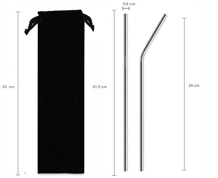 Set 2 srebrnih jeklenih slamic 215×8 mm, vrečke in čistila
