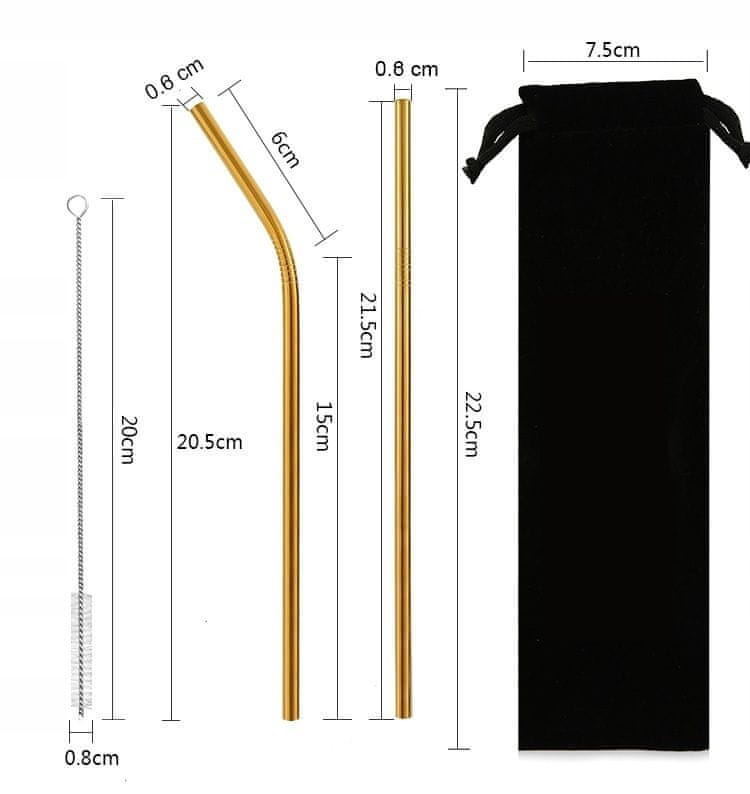 Set 4 zlatih jeklenih slamic 215×8 mm, vrečke in čistila