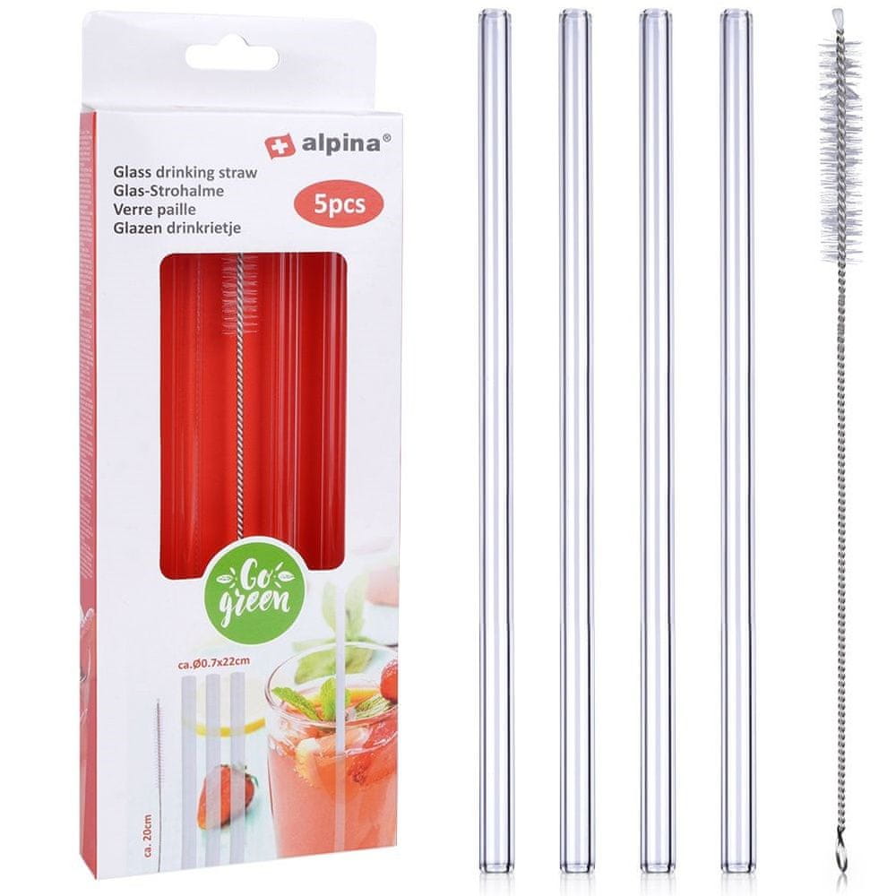 Komplet štirih slamic s čistilom. Odlične so tako za domačo kot za restavracijsko uporabo, čistilo pa bo olajšalo vzdrževanje čistoče slamic. Popolne so za vodo, koktajle, limonado, kavo, ledeni čaj, kapučino itd. Steklene slamice so ravno prave debeline, zato vam ni treba skrbeti, da bi se zlomile. Originalni izdelek nizozemske blagovne znamke Alpina. Izdelano po evropskih standardih.