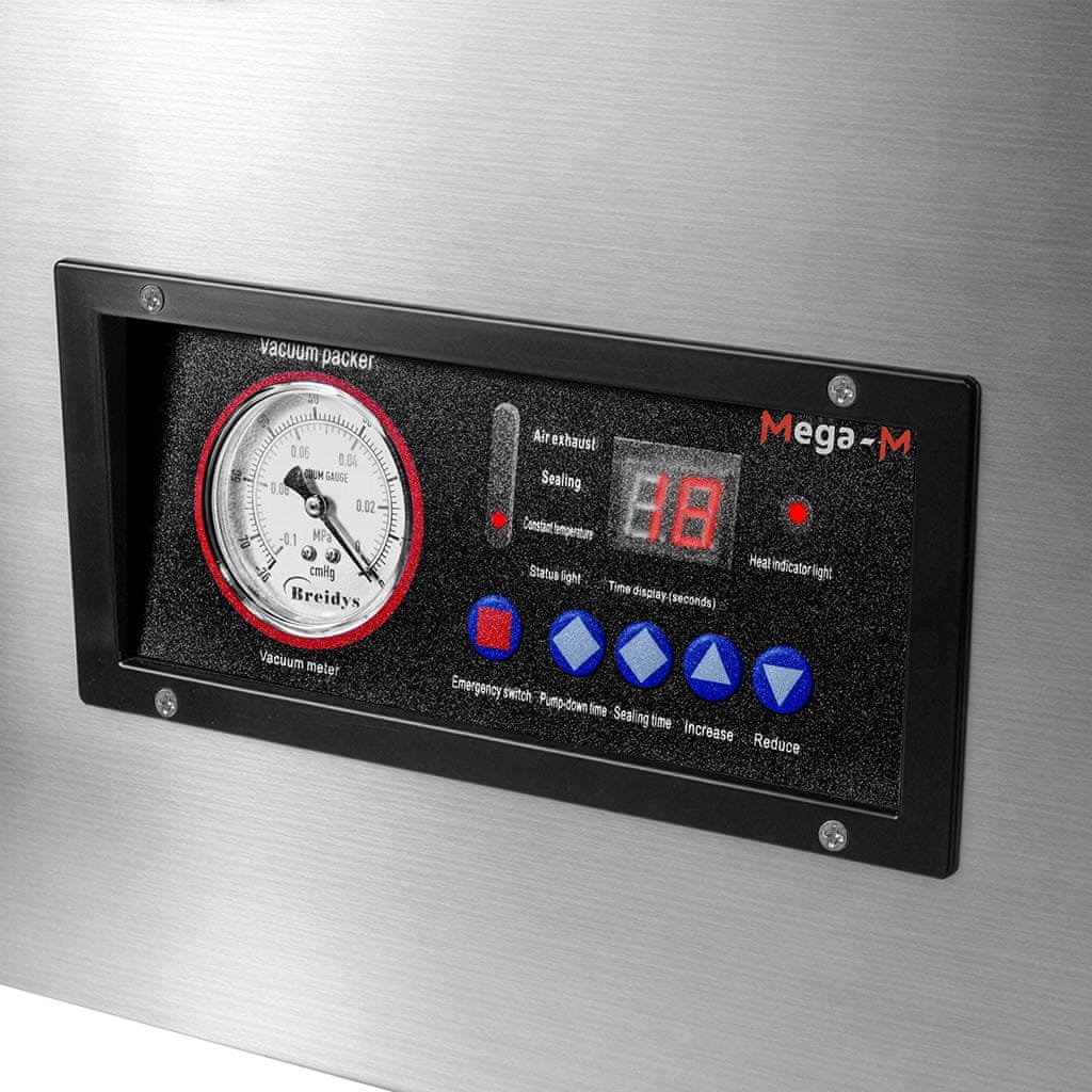 Naprava je izdelana iz nerjavečega jekla. Ima steklen pokrov in higiensko komoro iz nerjavečega jekla z zaobljenimi vogali za lažje čiščenje. Gumb STOP omogoča prekinitev postopka pakiranja v sili, vgrajeni manometer – indikator tlaka pa omogoča nadzor vakuuma