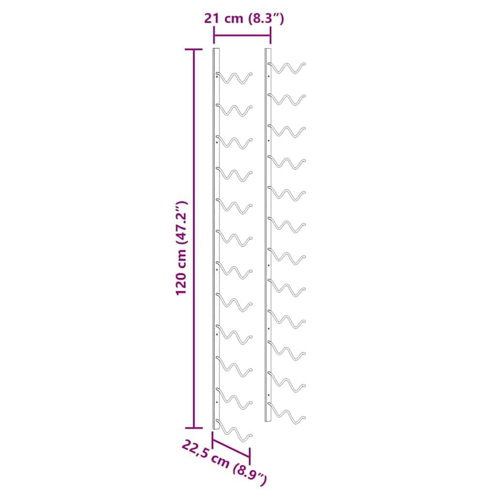 Paket vsebuje 2 stojali za vino, ki lahko shranita do 48 steklenic. Izdelani sta iz železa s prašnim premazom, zato sta zelo vzdržljivi in preprosti za vzdrževanje. Sta idealna izbira za darilo za vaše prijatelje in znance, ki so ljubitelji vina. S priloženim materialom za namestitev lahko stojali za vino enostavno namestite na steno. Stojali sta tudi preprosti za sestavo.