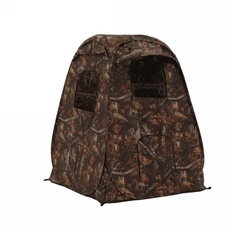 Prostoren vhod ima visokokakovostno zadrgo, ob odprtju ostane lepo na strani in je opremljen tudi z mrežico proti mrčesu v enakem maskirnem potisku. Tako je šotor z (rahlo) odprtimi vrati še vedno odlično zamaskiran. Ko vstopite v šotor, lahko opazite, da je zaradi črnega premaza na notranji strani zelo temen. Okna za fotografiranje in gledanje so na voljo na treh različnih ravneh: 2 spredaj (v višini oči in nizko), levo in desno pa jih boste našli na nekoliko nižji ravni kot spredaj. Okna za fotografiranje so opremljena z mrežo proti mrčesu, ki je sestavljena iz 2 delov, ki se na sredini prekrivata in sta opremljena z elastičnim trakom, tako da varno objameta vaš objektiv. V primeru dežja je mogoče zapreti tudi zunanjo tkanino in vstaviti objektiv skozi odprtino z zadrgo. Tako lahko še vedno snemate, hkrati pa vas in vašo opremo maksimalno zaščitite pred vetrom in vremenskimi vplivi.