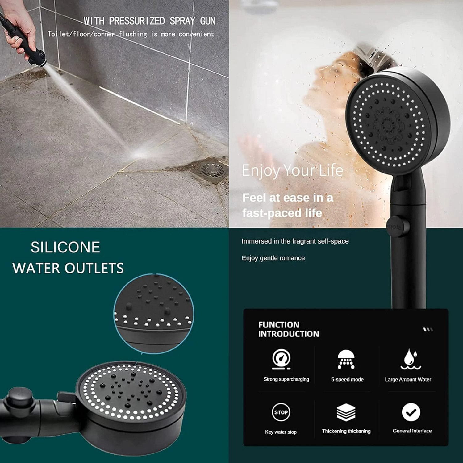 - Opremljen s kar 5 različnimi funkcijami prhe in funkcijo STOP.