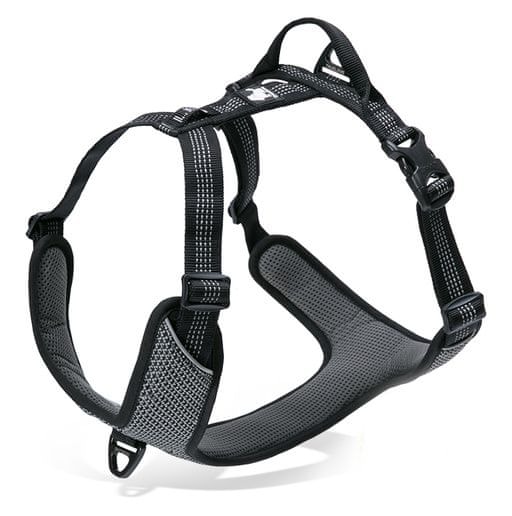 Oprsnica brez pritiska za pse – velikost M primerna za pse do 30 kg, posebna konstrukcija zagotavlja, da psa ne stiska prsnega koša ali grla, zaklep na zaponko, odsevni elementi, ročaj na vrhu. kavelj za povodec.