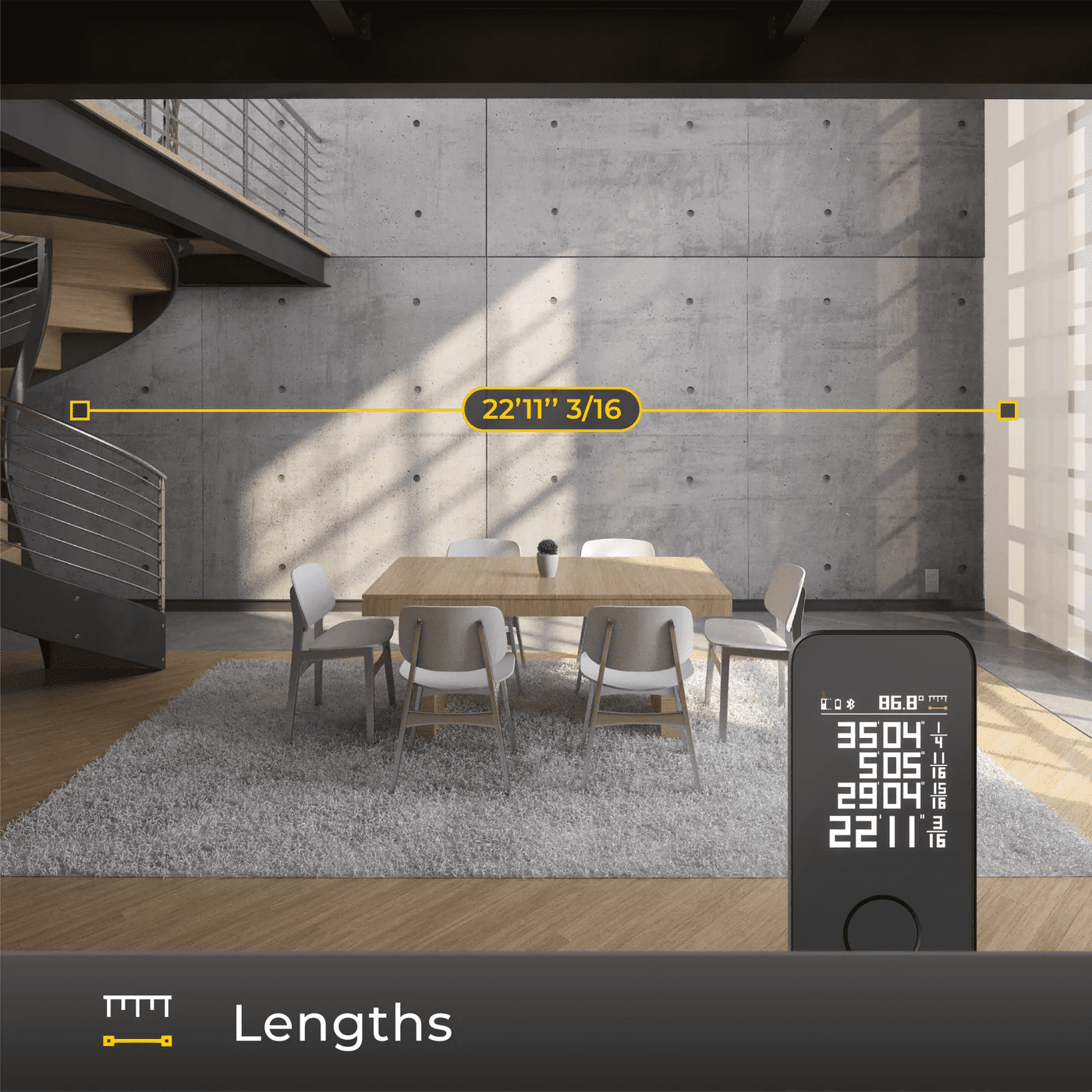 Naprava ima pet vnaprej nameščenih merilnih načinov, ki jih lahko enostavno aktivirate s stranskim gumbom. Po končanem merjenju naprava sproži vibracijsko opozorilo za jasno in takojšnjo obvestitev. Merilnik meri razdaljo, kot, višino, površino in virtualno ravnilo. V aplikaciji lahko uporabite tudi funkcijo fotoaparata za fotografiranje objekta in njegovo merjenje.
