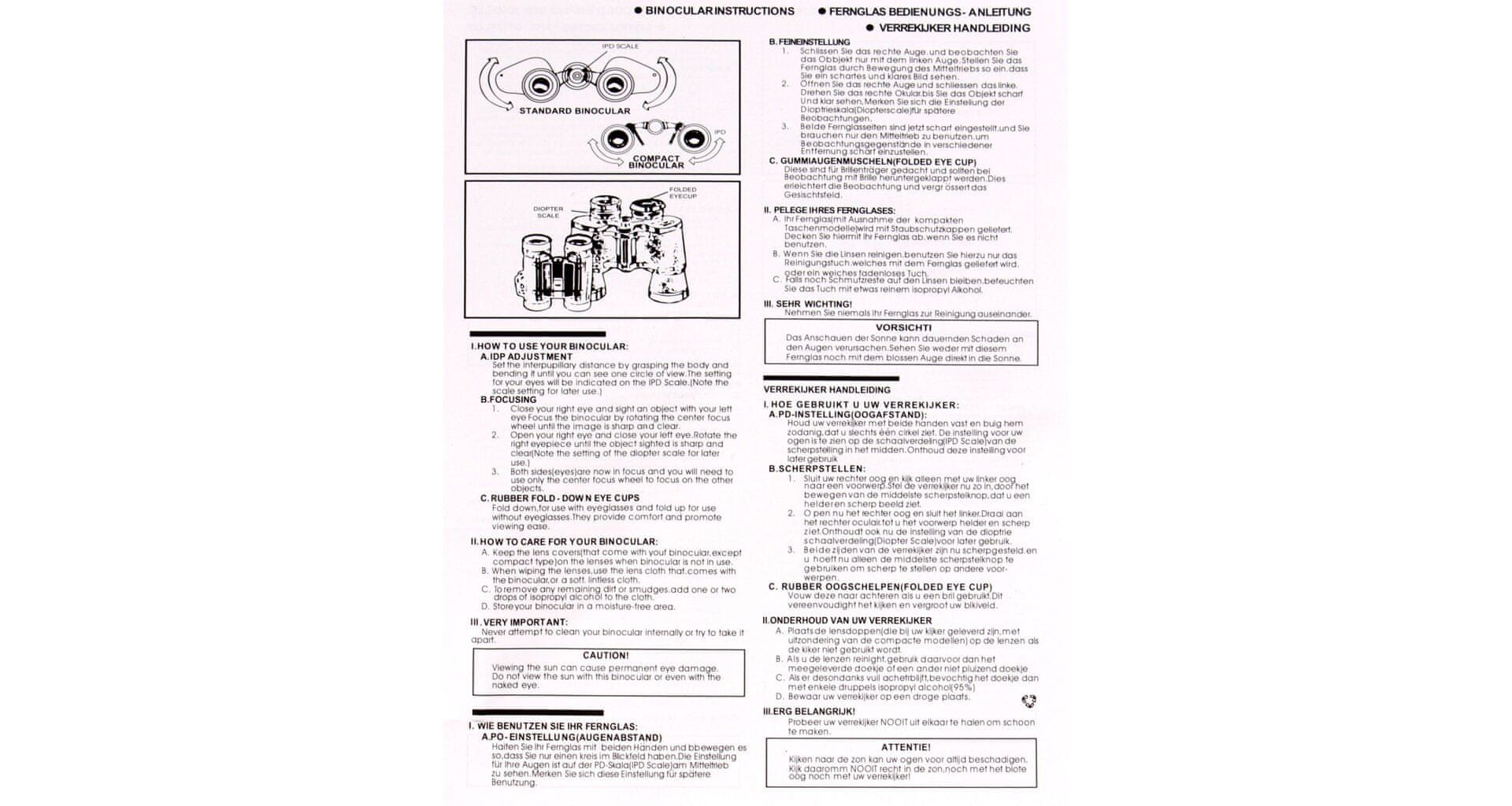 Raziščite lepoto narave in nočnega neba z Mercovim daljnogledom 20 × 50 z 10-kratno povečavo in premerom objektiva 50 mm. Ta daljnogled vam zagotavlja ostro in jasno sliko tudi na večjih razdaljah. Z vidnim poljem 65° in vidnim poljem 114 metrov na razdalji 1000 metrov boste imeli vedno odličen pregled nad okolico. Daljnogled ima premer izstopne zenice 5 mm in očesni relief 118 mm, kar zagotavlja udobno gledanje tudi uporabnikom očal. Z najbližjo razdaljo ostrenja le 7 mm je ta daljnogled idealen tudi za opazovanje od blizu na kratkih razdaljah. 900 g teže in 18 cm dolžine zagotavljata, da je ta daljnogled kompakten in enostaven za prenašanje, zato je odličen sopotnik na potovanjih. Raziskujte svet z našim daljnogledom in ne spreglejte nobene podrobnosti! Ko daljnogleda ne uporabljate, imejte pokrovčke objektivov in objektivne leče nameščene. Za čiščenje leč in objektiva uporabljajte le antistatično krpo. Ne razstavljajte daljnogleda. Daljnogledov ne izpostavljajte prekomerni vlagi – Povečava: 10 x – Zorni kot: 65° – Širina vidnega polja: 114 m / 1000 m – Premer objektiva: 50 mm – Nastavitev razdalje med okularji: 58 – 70 mm – Dimenzije daljnogleda: 18 × 20 × 8 cm – Teža daljnogleda: približno 07 kg – Dodatna oprema: etui s pokrovčki in krpo s trakom