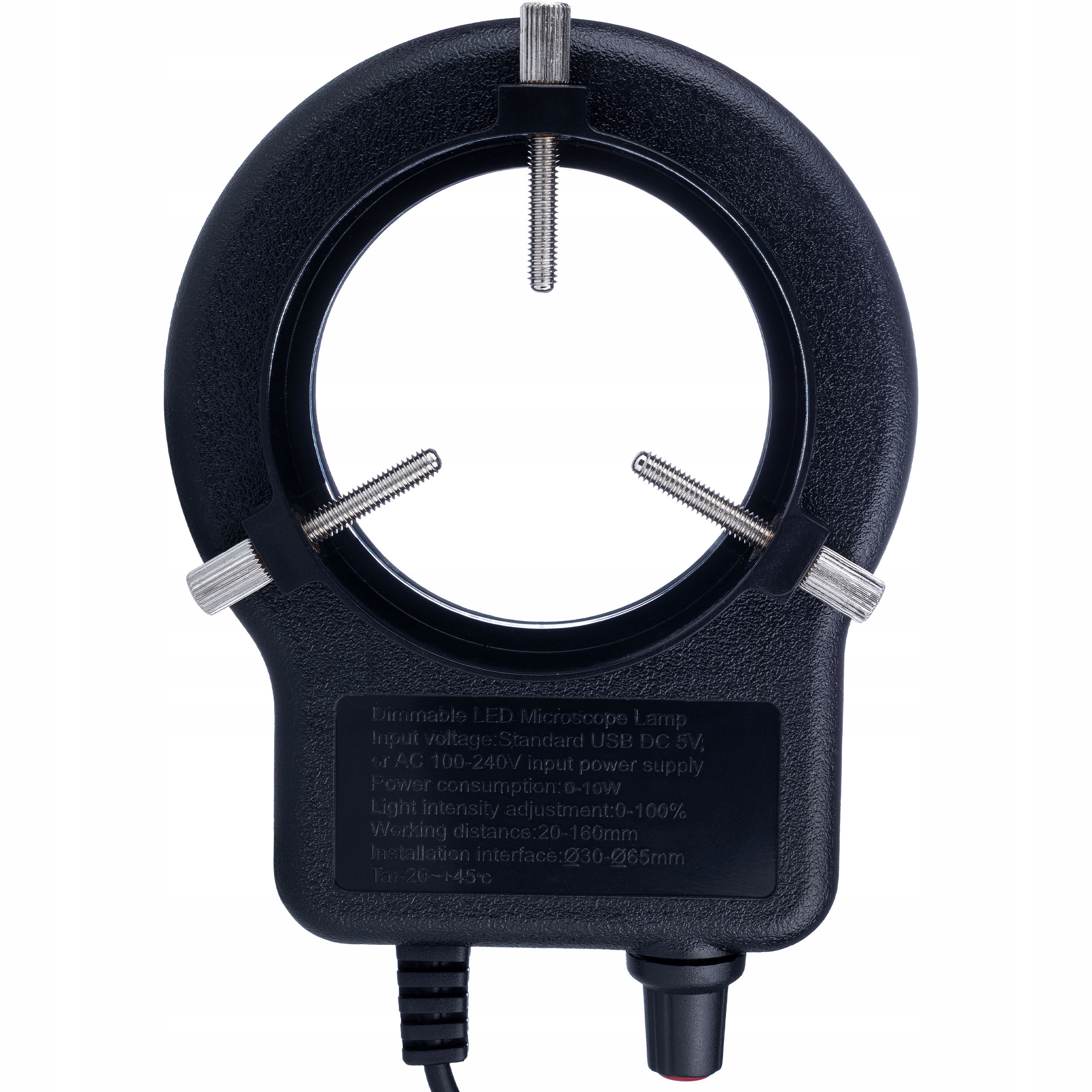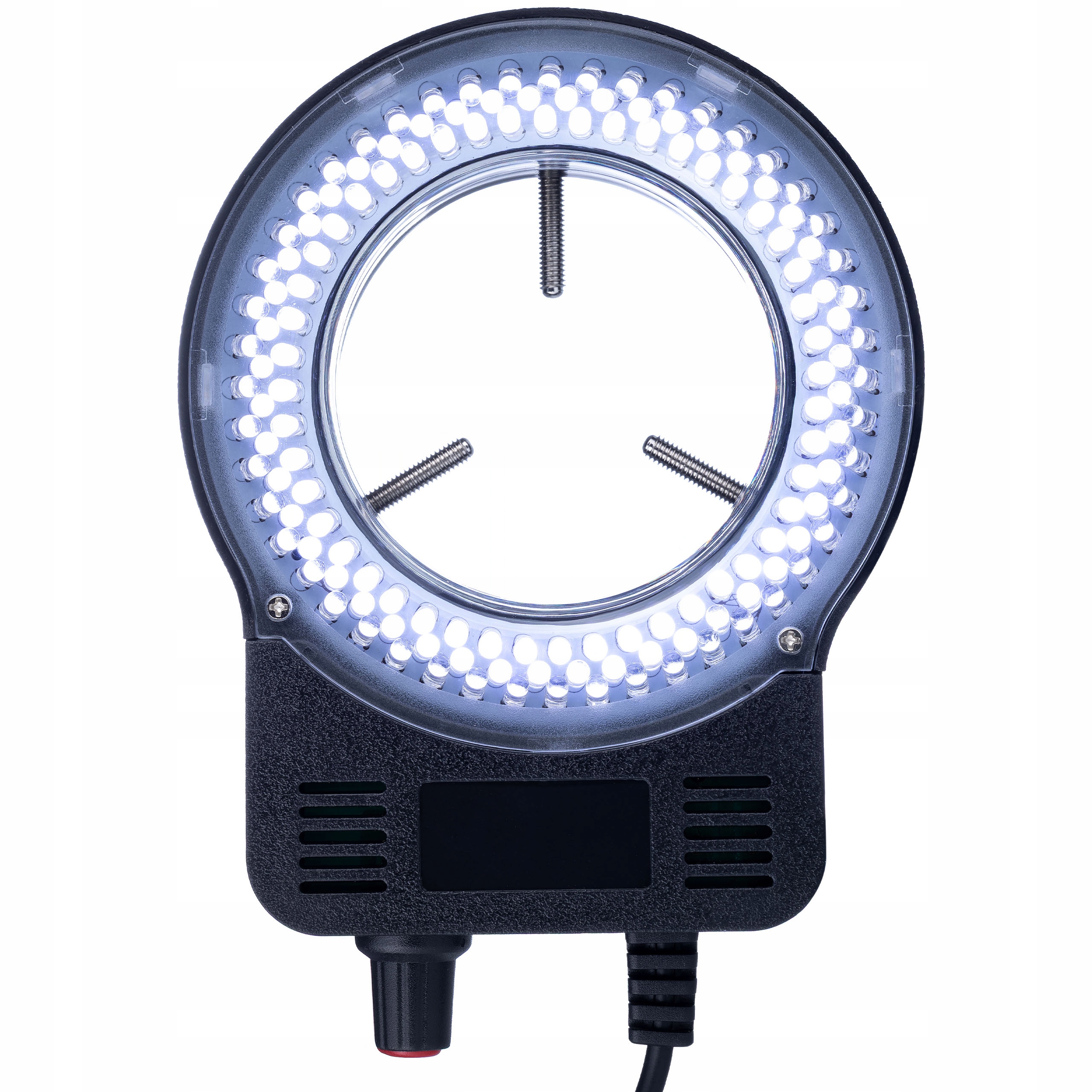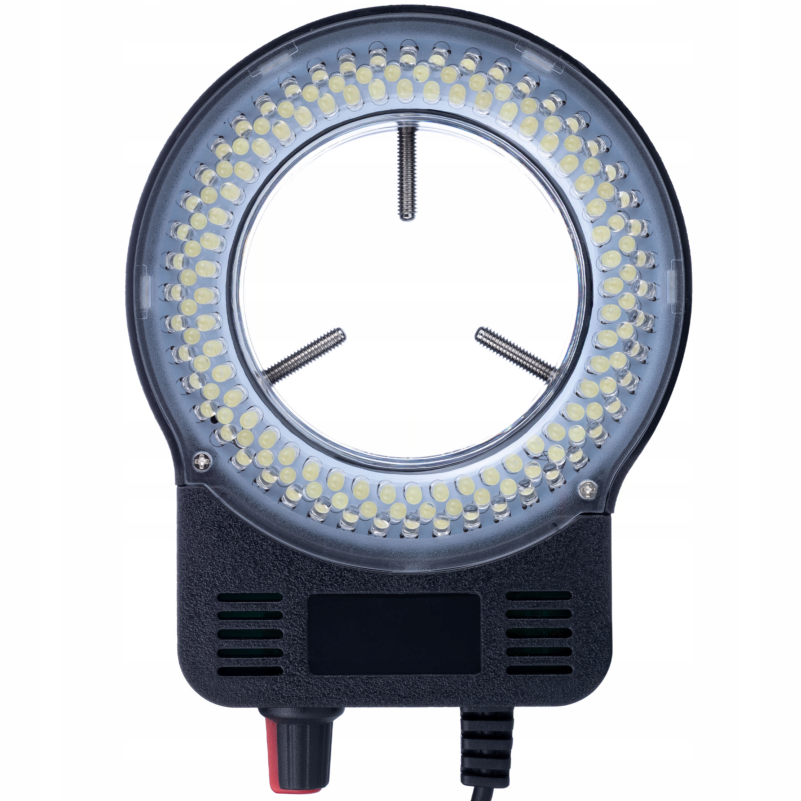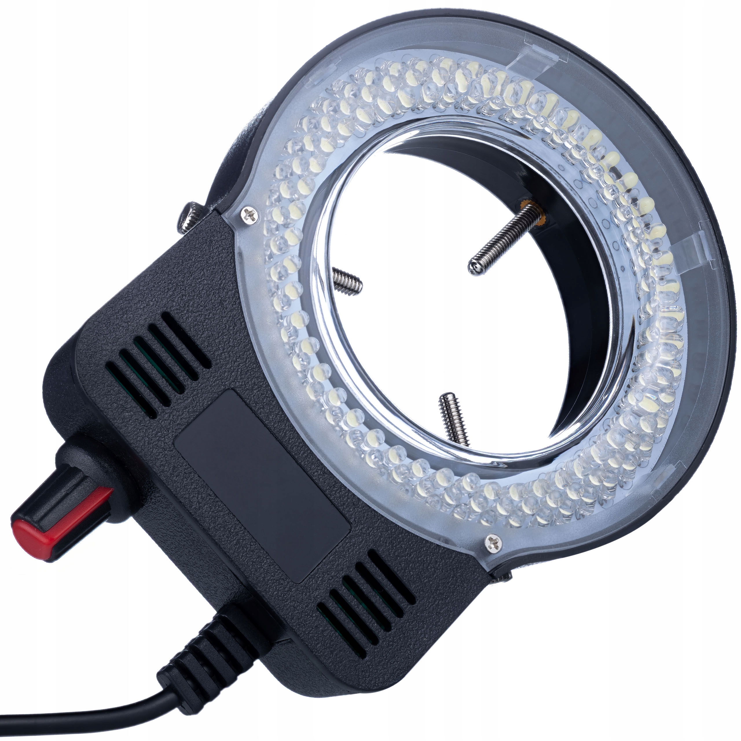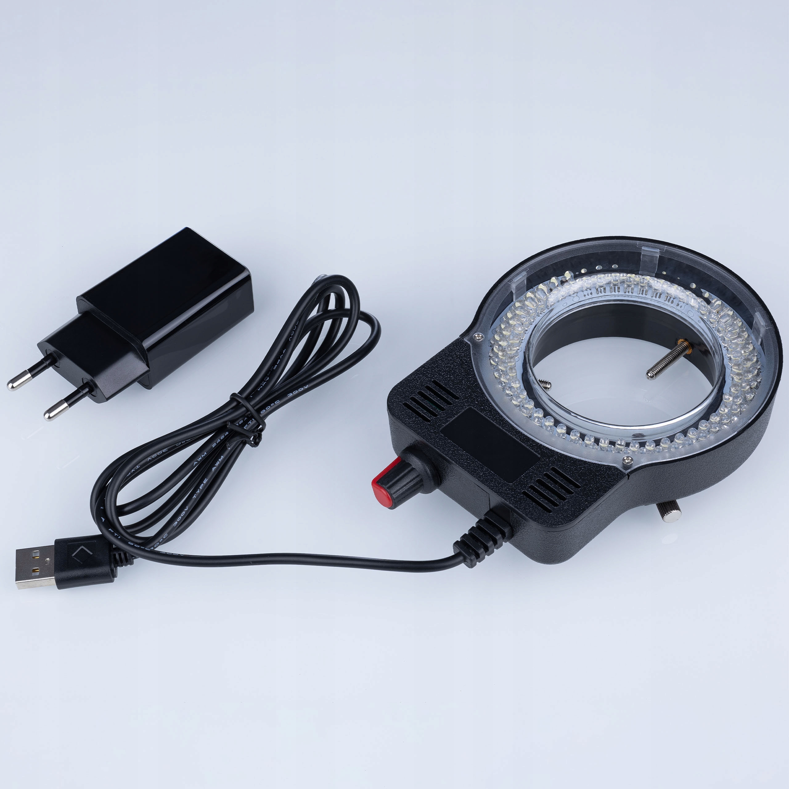 MicroBright 144 LED USB RingLight – Oświetlenie pierścieniowe do mikroskopu | USB + zasilacz | 0–10W | Regulacja jasności 0–100% | Średnica montażu 30–65 mm