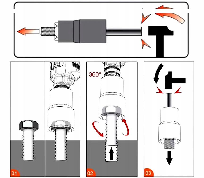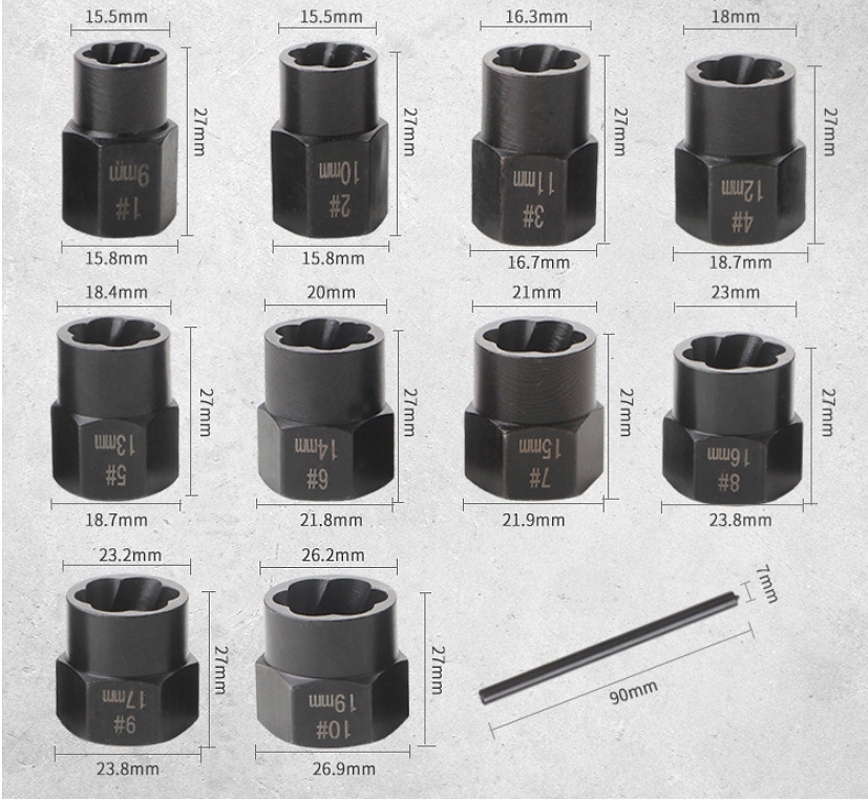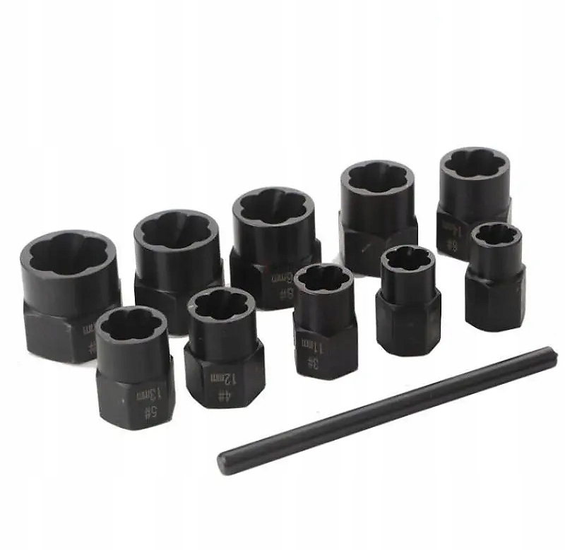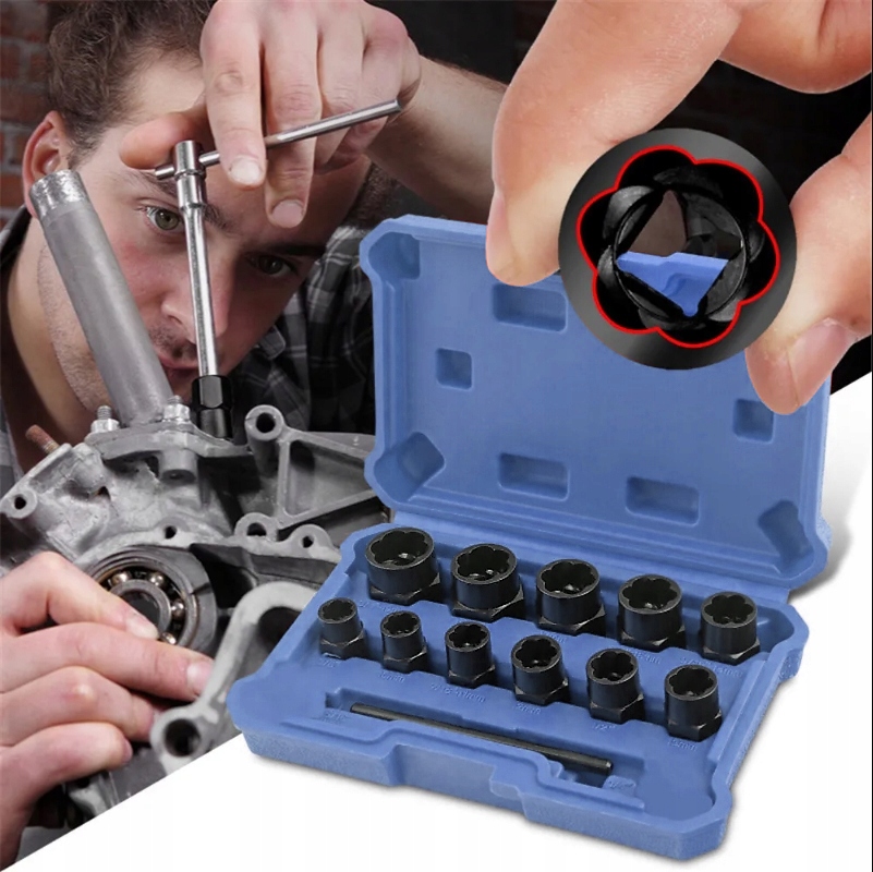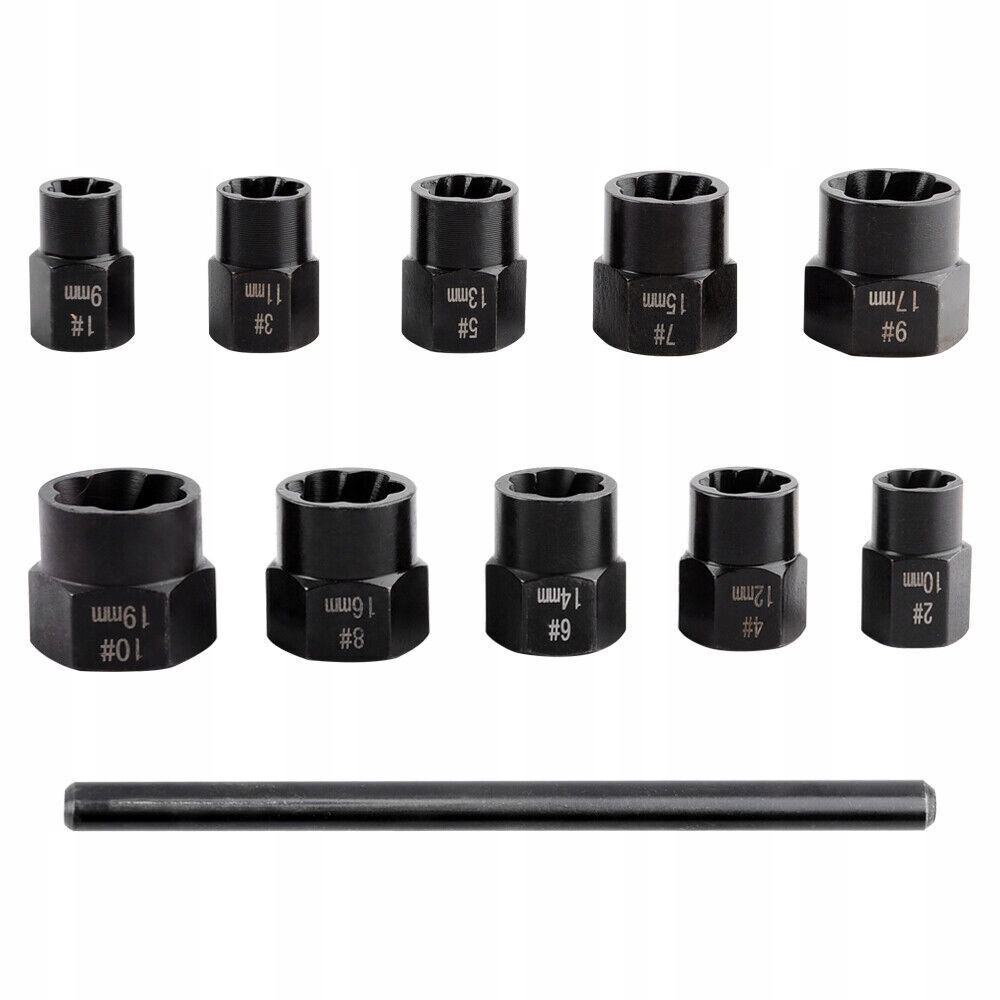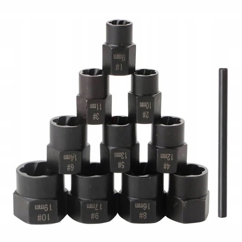 Komplet nastavkov za specializirano odstranjevanje poškodovanih vijakov, matic in drugih komponent. Nastavki imajo edinstveno notranjo obliko, ki jim omogoča, da se zagrizejo v glavo komponente in se varno primejo, kar zagotavlja večjo natančnost in učinkovitost. Zunanja zasnova nastavkov omogoča uporabo viličastega ključa ali 6-krakega nastavka. Za ohranjanje natančnosti uporaba udarnega ključa ni priporočljiva.