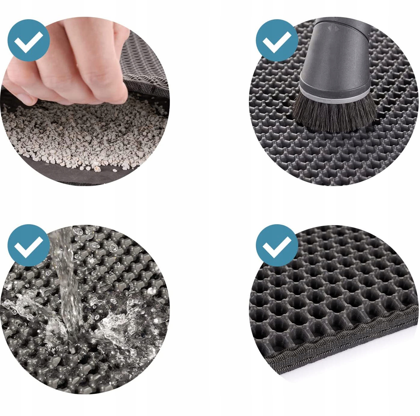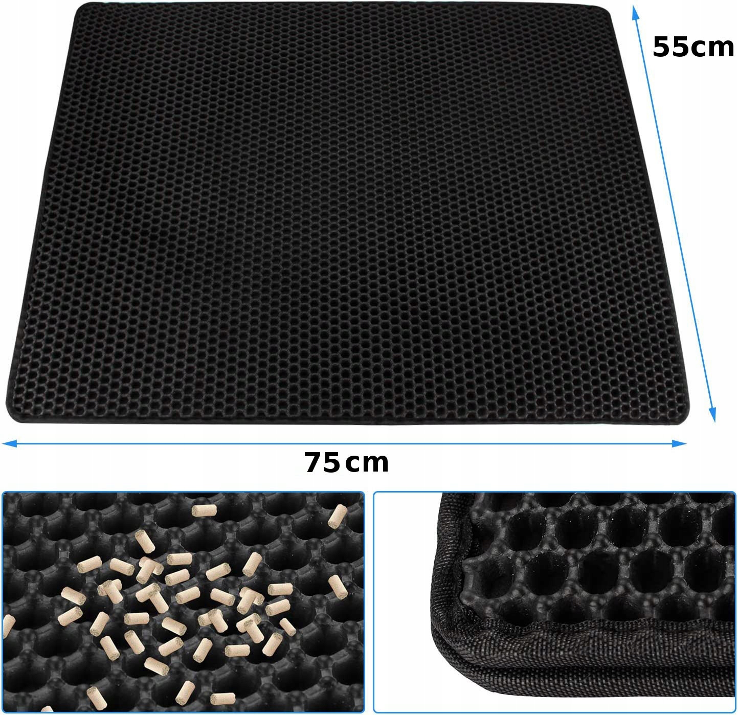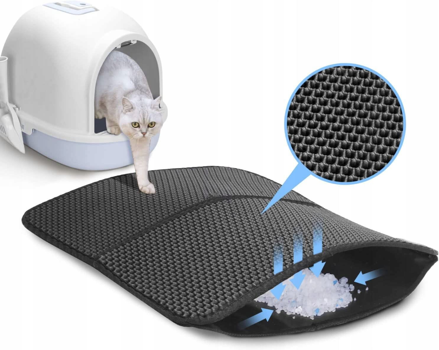 Higienska mačja podloga. Učinkovito lovi stelje in pesek iz mačjega stranišča. Zatesnjeno dno preprečuje puščanje odpadkov na tla.