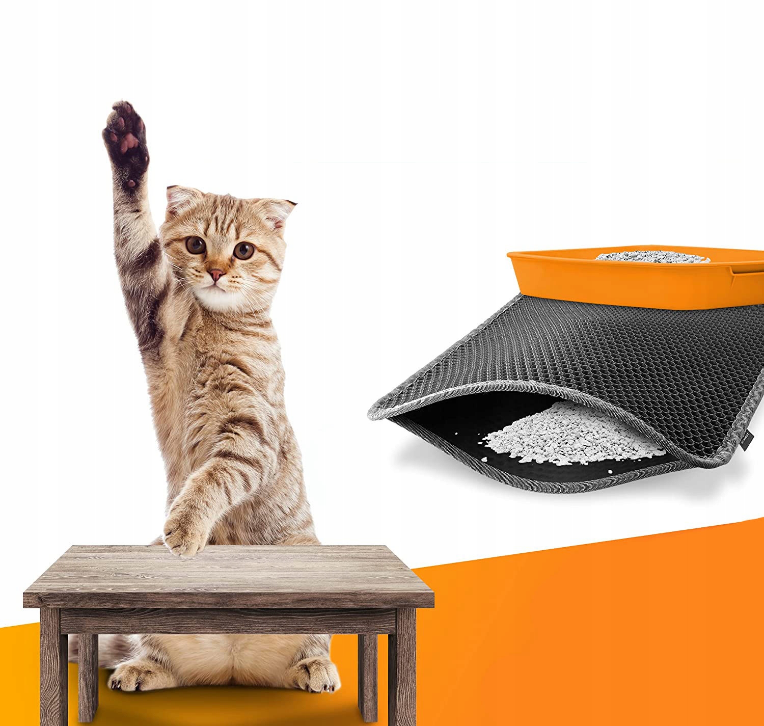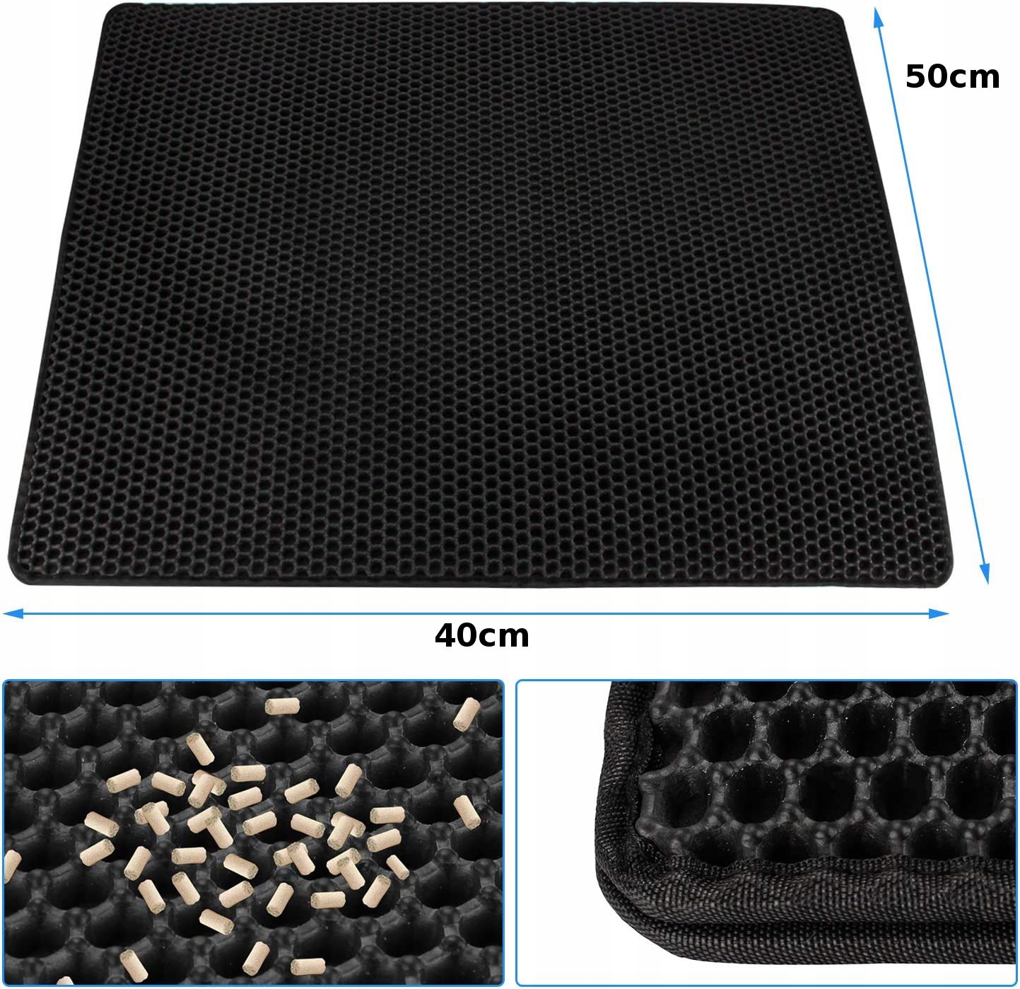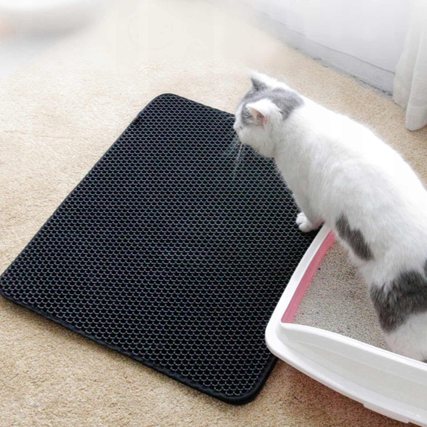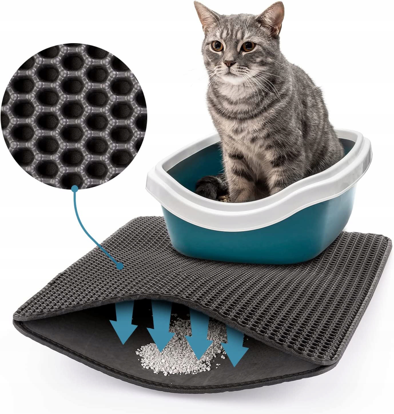 Higienska mačja podloga. Učinkovito lovi stelje in pesek iz mačjega stranišča. Zatesnjeno dno preprečuje puščanje odpadkov na tla.
