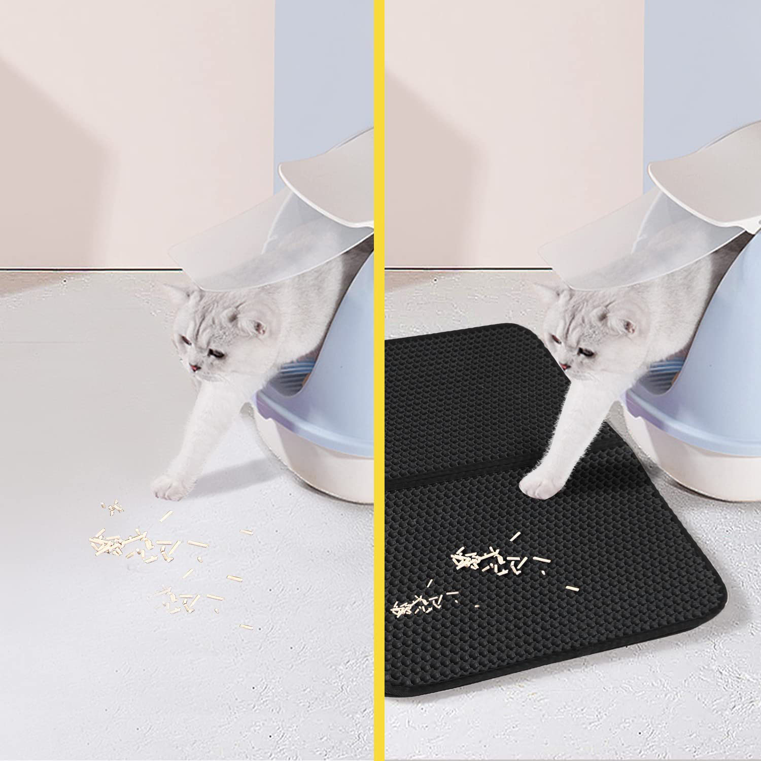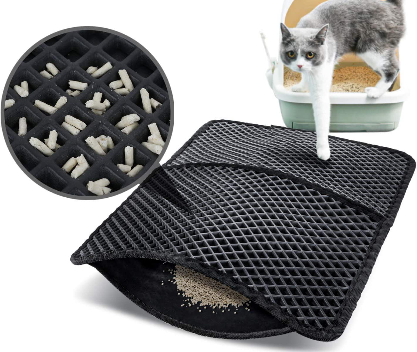 Preprosto jo postavite poleg mačjega stranišča in vaša mačka bo za seboj puščala delce stelje, ko bodo šli skoznje. Podloga je izdelana iz dveh plasti – mrežice za lovljenje odpadkov in nedrseče spodnje plasti.