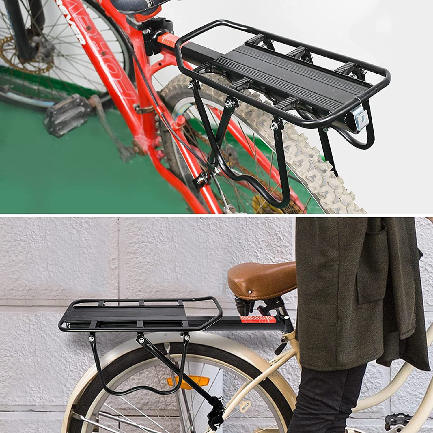 Visokokakovosten univerzalni aluminijasti nosilec za kolo z največjo nosilnostjo do 50 kg. stabilno pritrjen na sedežno cev (premer cevi 27,2 mm–31,8 mm) in na zadnji del okvirja z uporabo hitre sprostitve (hitra montaža same platforme na sedežno cev) in vijakov, ki zagotavljajo stabilno oporo.