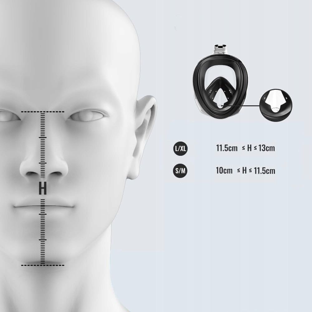 Naša maska zagotavlja neprimerljivo polno 180° , ki vam omogoča opazovanje podvodne okolice v vse smeri. Pozabite na ozek vidni kot in omejitve tradicionalnih mask. Naša maska je zasnovana tako, da vam omogoča maksimalno vidljivost in neomejeno perspektivo . Ne glede na to, ali se potapljate v kristalno čistih tropskih vodah ali v nekoliko manj čistih pogojih , naša maska omogoča edinstveno podvodno izkušnjo.