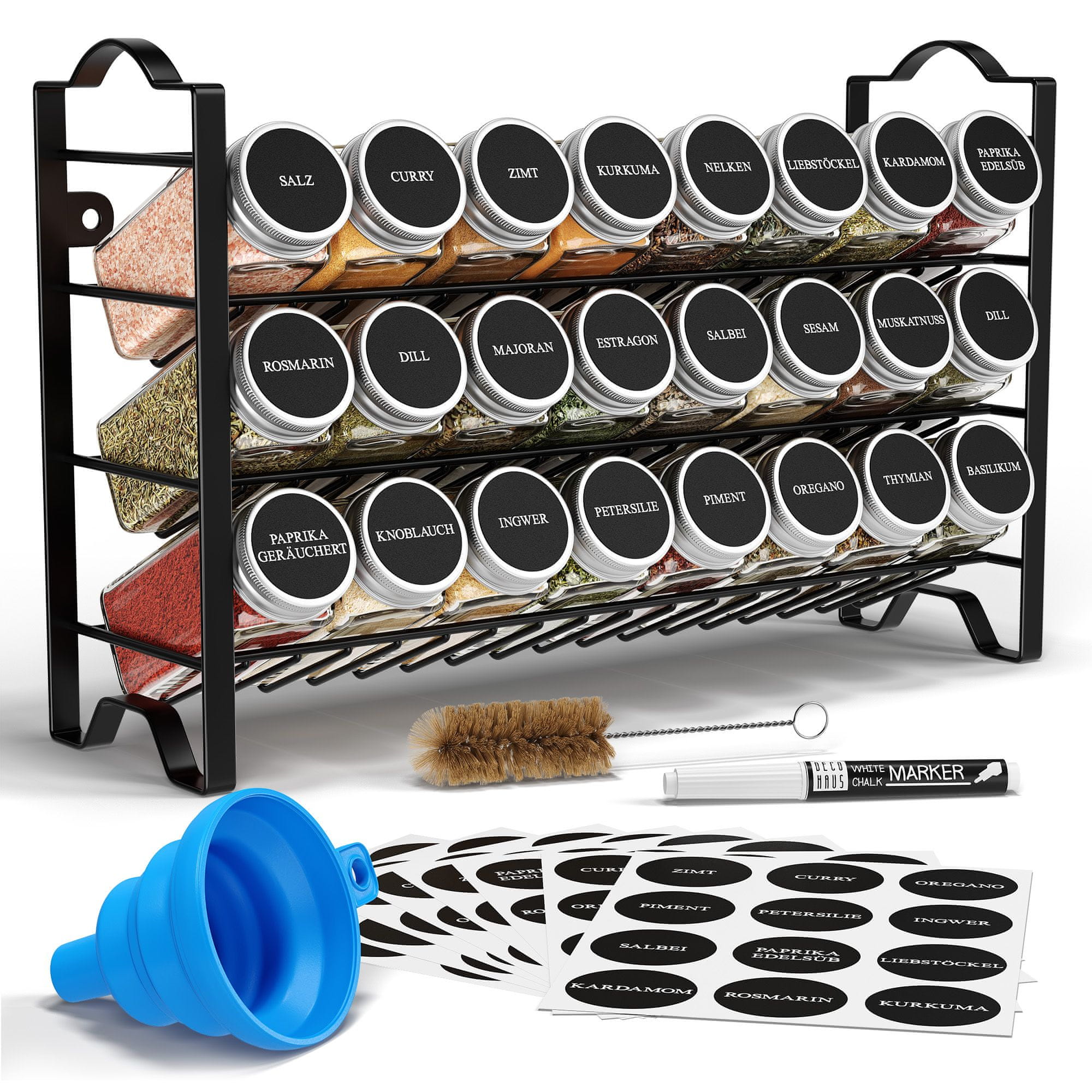 Deco Haus Stojalo za začimbe s 24 steklenimi kozarčki za začimbe – kovinsko črno stojalo z 48 nalepkami, krtačko, lijakom – postavite na pult ali obesite na steno - pokrovčki iz aluminija