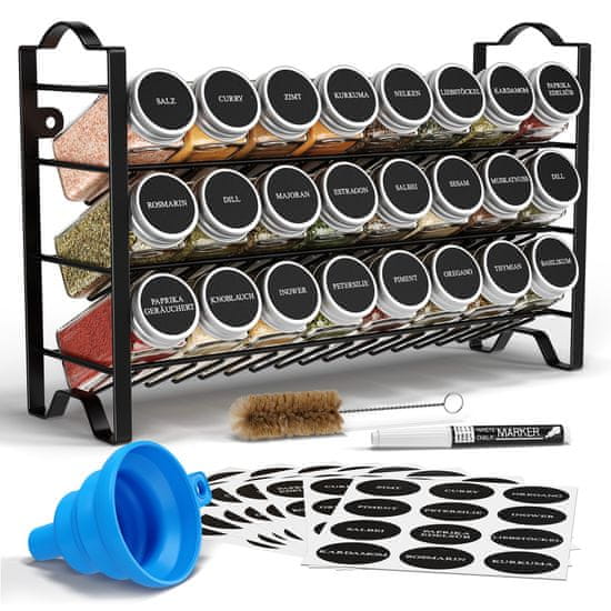 Poslovite se od neurejenega pulta! S tem kuhinjskim kompletom imate vse svoje najljubše začimbe vedno pri roki. Komplet vsebuje stojalo za začimbe, lepilne blazinice, 24 kozarčkov za začimbe, 48 praznih in prednatisnjenih nalepk (v angleščini in nemščini), krtačko, kredno pisalo, dva pokrovčka za stresanje različnih velikosti, lijak, kaveljčke in vijake za pritrditev na steno. Vse, kar potrebujete, da imate začimbe urejene in pri roki.