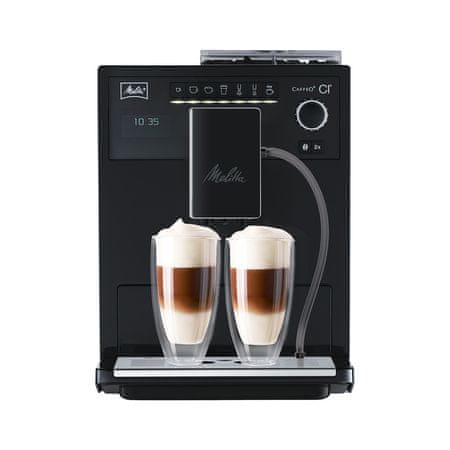 En dotik – En dotik Kaj si želite? Espresso, café crème, cappuccino ali latte macchiato? Nič ni lažjega. Te kavne specialitete so vnaprej programirane in jih lahko izberete s pritiskom na gumb. S tipalom One Touch lahko enostavno in priročno izberete tudi toplo mleko, spenjeno mleko ali vročo vodo. CI ima dvojno posodo za kavna zrna „Bean Select“ (ročna izbira), ki vam glede na recept in osebni okus omogoča izbiro na primer blagih ali močno aromatičnih kavnih zrn. Pokrovček Aromasafe® in črna posoda pomagata ohraniti intenziven okus kave. Funkcija Moja kava Ne želite vsakič znova nastavljati parametrov svoje kave? Ni problema! S funkcijo „Moja kava“ lahko individualno programirate svoje najljubše recepte za kavo. Melitta® CI® shrani nastavitve vaših želja za največ 4 osebe. Italijanski način priprave kave Italijanski postopek priprave kave zagotavlja pristen okus, saj zagotavlja, da so sestavine dodane v pravilnem vrstnem redu v skladu z izvirnim italijanskim receptom. Za latte macchiato se espresso doda za mlekom in spenjenim mlekom, za kapučino pa je obratno. Barvni zaslon LCD Za nemoteno premikanje po meniju uporabite številčnico. Zaradi razumljive postavitve menija in osvetljenih gumbov je uporaba aparata preprosta in intuitivna. besedilni zaslon vam bo vedno povedal, kaj morate storiti, od priprave kave do samodejnega čiščenja.dve kavi naenkratS funkcijo dve kavi naenkrat lahko hkrati pripravite dve kavi z mlekom ali brez.izliv za kavo Ločeni curki za kavo, mleko in vročo vodo omogočajo enostavno pripravo najljubše pijače, ne da bi premaknili skodelico. Izlivka ima vgrajeno tudi osvetlitev LED in je nastavljiva po višini do 140 mm, tako da je na voljo tudi prostor za visoke kozarce za latte macchiato. Odstranljiva enota za kuhanje Enota za kuhanje je enostavna za čiščenje, saj jo je zelo enostavno odstraniti in očistiti, kar še olajša čiščenje celotnega aparata. Enostavno čiščenje s paro Hitro in higienično čiščenje delov, ki so v stiku z mlekom, z vročo vodo in paro.