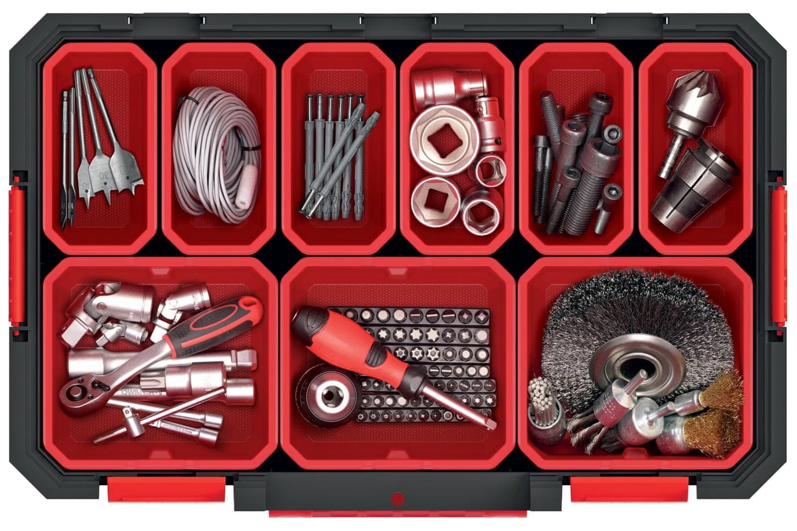 Modularni organizator je zasnovan s prevleko iz polikarbonata, odpornega na udarce. Ergonomski ročaj omogoča prenašanje organizatorja kot kovčka. Ima trdno rebrasto konstrukcijo, ki zagotavlja visoko odpornost na mehanske poškodbe.