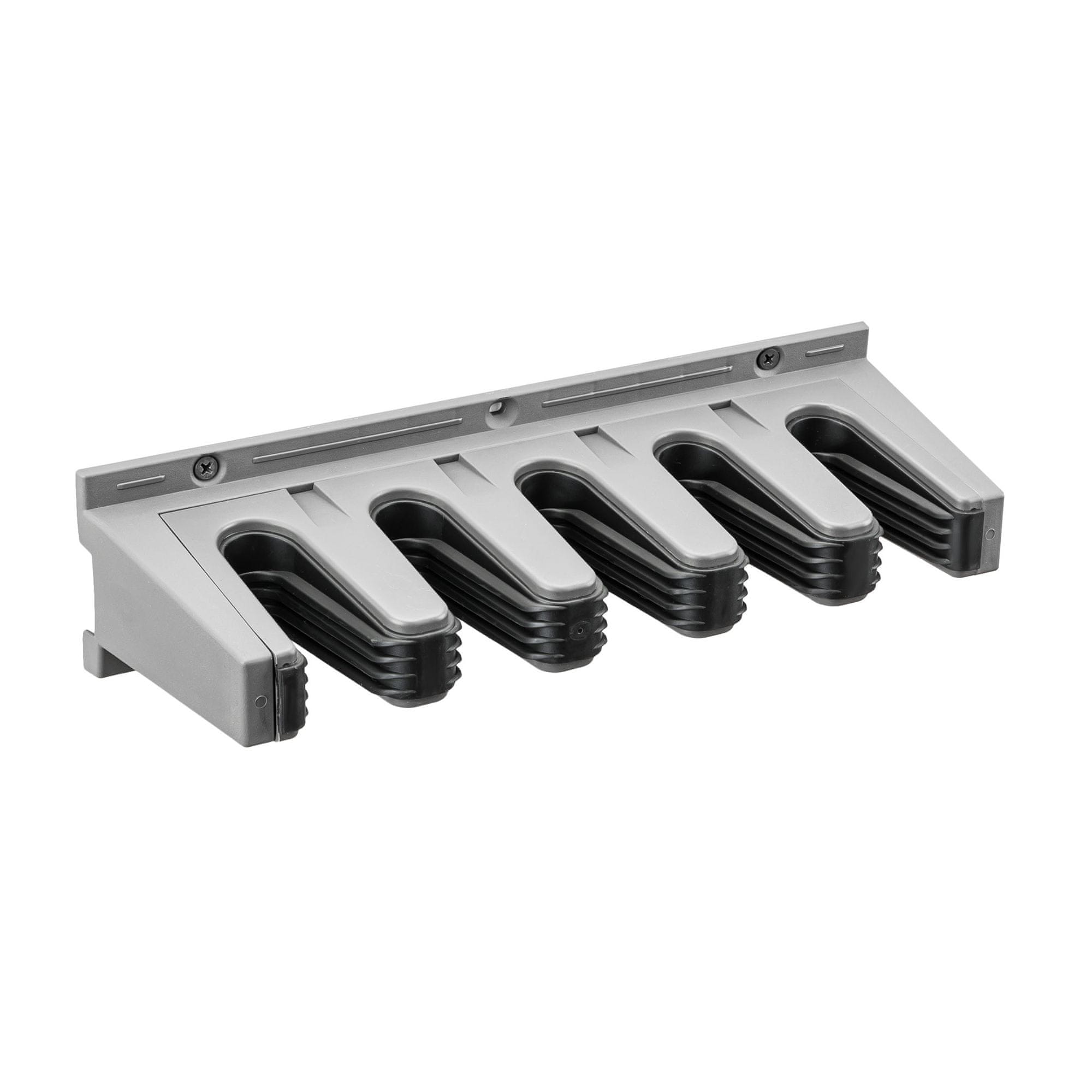 Držalo za večje naprave iz umetne mase z gumijastimi sponkami in kavlji za stensko montažo.