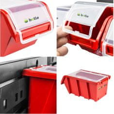 Stenska plošča za orodje s škatlami za zlaganje Botle – delovno mesto je vedno čisto in urejeno. Komplet sestavlja 6 plošč skupne velikosti 173 × 78 cm a 198 kos škatel, prikazanih na fotografijah, je izdelan iz plastike visoke trdnosti. Praktičen set lahko pritrdite na steno kamor koli.
