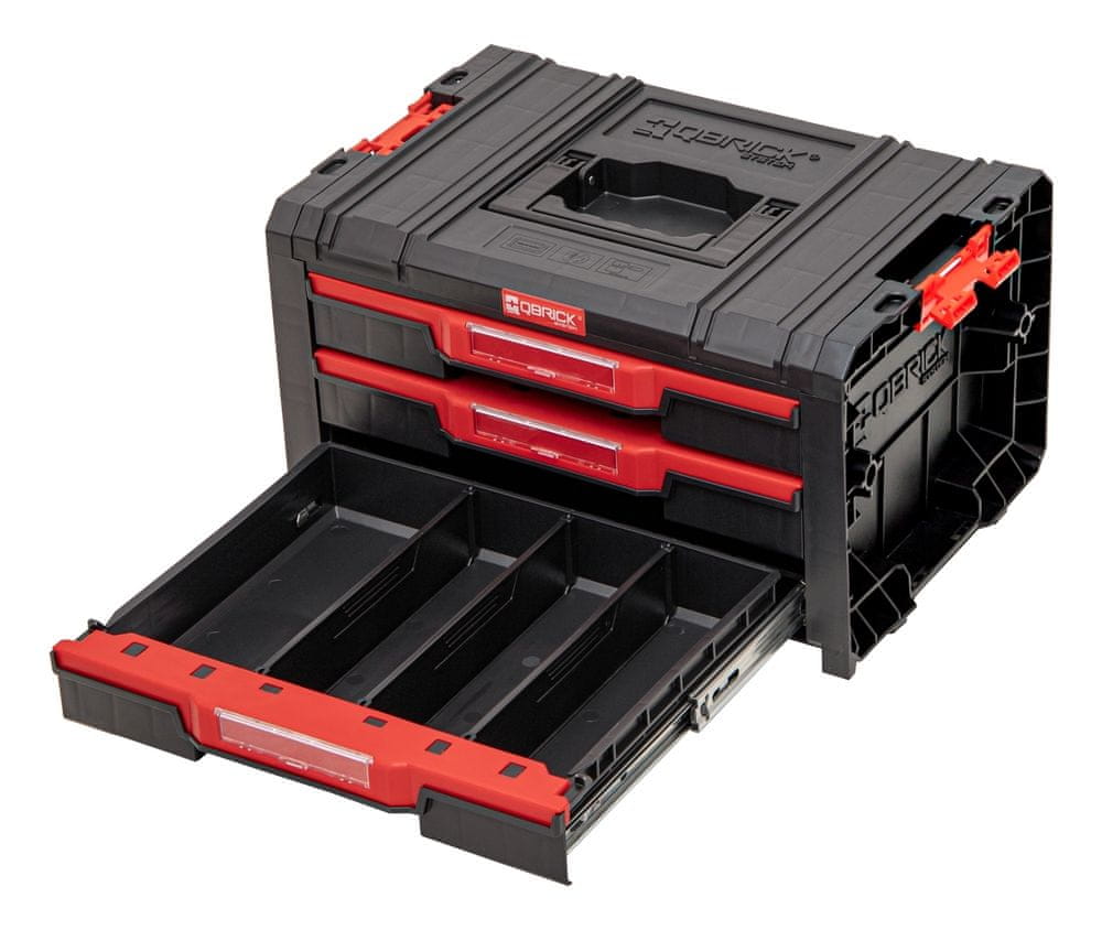 Qbrick System Pro organizator 3 je prostorna in modularna omarica iz serije PRO, zasnovana za učinkovito organizacijo delavnice. Omogoča zlaganje in enostavno povezovanje z drugimi moduli, kar vam omogoča ustvarjanje prilagojenih sistemov za shranjevanje. Opremljen je s tremi predali, ki drsijo na kovinskih vodilih, kar zagotavlja gladko in zanesljivo delovanje. Vsak predal ima priročen gumb za enostavno izvlečenje, kar olajša dostop do shranjenih predmetov.