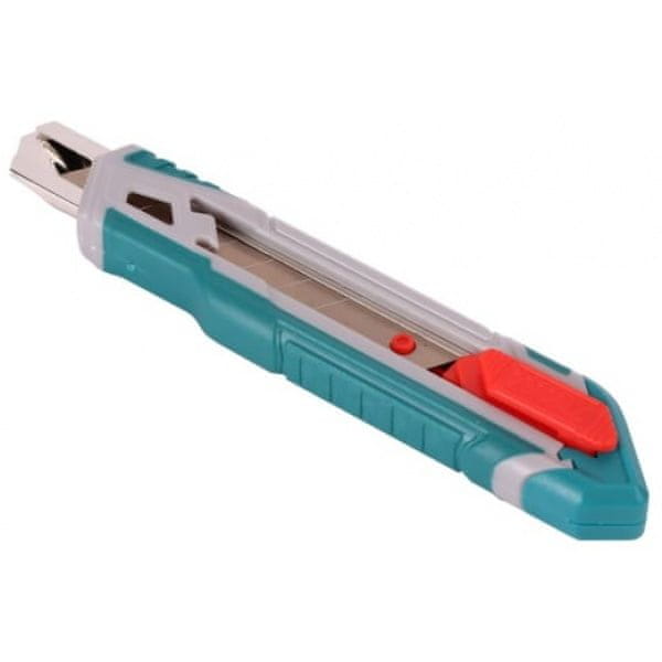 Pisarniški/grafični nož z lomljivim rezilom TOTAL THT511815 se uporablja za rezanje papirja, kartona, tapet, tanjših preprog in drugih materialov. Dolžina orodja je 179 mm, velikost rezila pa 18×100 mm. Orodje ima segmentirano rezilo iz ogljikovega jekla (THT519112). To omogoča dolgotrajno uporabo noža brez obrabe. Udoben plastičen ročaj zagotavlja zanesljiv oprijem brez zdrsa.