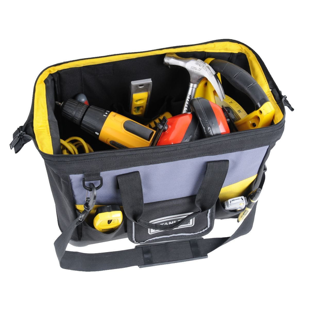 Stanley torba za orodje z zgornjim odpiranjem – 600 × 600 denski materijal za večja bremena, trpežen in vzdržljiv – Trdna oblika, ki lahko sama stoji v odprtem položaju in tako omogoča dostop do vsega orodja – Maksimalno organiziranost omogočajo številni notranji in zunanji žepi – Nastavljiv ramenski trak za lažje nošenje orodja – Sprednji pokriti žep zagotavlja varno shranjevanje majhnih delov ali osebnih predmetov – Ojačano in trpežno dno iz plastike ščiti pred mokrimi in vlažnimi površinami Prodajalec : Eprim d.o.o. Krožna cesta 10, 1230 Domžale, Slovenija E-naslov: manager@eprim.si