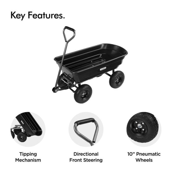 • Ta priročen vrtni pomočnik se ponaša z močno plastično kadjo prostornine 75L, transportira pa lahko do 250kg tovora, oziroma v primeru uporabe kiperja do 180kg.