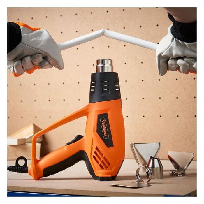 Zmogljiva toplotna pištola VonHaus 2000W, idealna za obnovo, odstranjevanje barve, lepila, upogibanje bakrenih cevi, obnovitev žara in več. Ima 2 delovni temperaturi in vgrajen termostat za preprečevanje pregrevanja. Priložene so 4 specializirane šobe. Izdelana iz ojačanega PP kompozita. Celoten opis