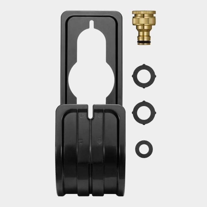 V kompletu prejmete vse, kar potrebujete za enostavno delo na vrtu: 3/4” priključek za pipo, 1/2” adapter za univerzalno uporabo, rezervne tesnilke in lepilni trak za popravila, vrečo za shranjevanje brez navlake ter kavelj za pritrditev. Kavelj lahko preprosto obesite na zunanjo pipo ali ga pritrdite na steno (vijaki za montažo na steno niso priloženi).