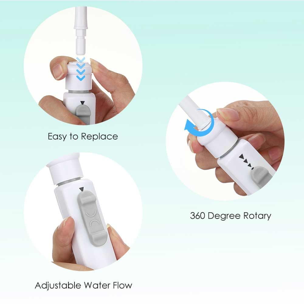 ENOSTAVNA NAMESTITEV in UPORABA! Samo priključite izdelek na pipo, elektrika ni potrebna, usta lahko splaknete brez pogostega polnjenja vode, kot je to potrebno pri običajnih zobnih prhah.