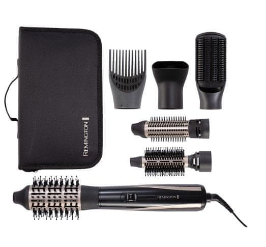 Remington oblikovalnik las na vroči zrak poskrbi za hkratno sušenje las in oblikovanje pričeske, brez potrebe po uporabi dodatnih pripomočkov in brez pretirane toplote. Opremljen je s šestimi zamenljivimi nastavki, ki nudijo glajenje las, dodajanje volumna in oblikovanje kodrov. Izbirate lahko med dvema nastavitvama temperature/hitrosti delovanja in s tem prilagodite oblikovanje svojemu tipu las, brez skrbi glede poškodovanja las. Ponaša se z ionsko funkcijo, ki preprečuje nastajanje statične elektrike in razmršenosti las. Nudi tudi hladen zrak za zaključno oblikovanje pričeske in odstranljivo rešetko za enostavno čiščenje. Ima dodano torbico za shranjevanje.