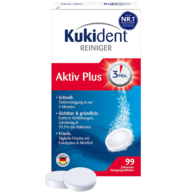 Delovanje : Kukident Aktiv Plus deluje v več fazah: raztaplja obloge, odstranjuje bakterije in odstranjuje madeže, zaradi česar so zobne proteze čiste in sveže. Redna uporaba preprečuje nastanek zobnega kamna in ohranja zobne proteze v dobrem stanju.