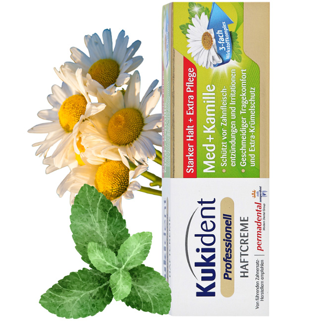 Kukident Professionell Med in kamilica je napredna krema za lepljenje zobnih protez, ki nudi zanesljiv celodnevni oprijem in dodatno nego dlesni in ustne votline. Posebna formula s kamilico in meto pomaga zaščititi dlesni pred vnetjem in draženjem, hkrati pa zagotavlja udobno prileganje. Izdelek je idealen tako za popolne kot delne zobne proteze, zaradi veganske formule pa je primeren za tiste, ki cenijo naravno nego.