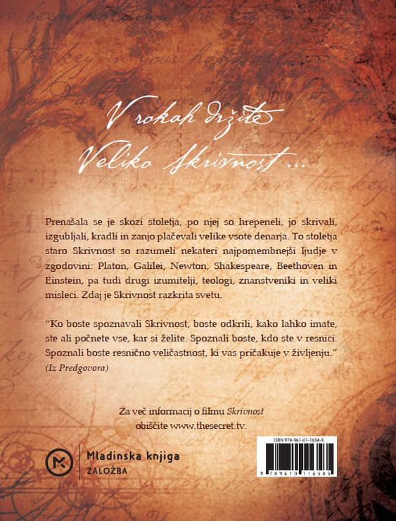 Velika skrivnost… se je prenašala skozi stoletja, po njej so hrepeneli, jo skrivali, izgubljali, kradli in zanjo plačevali velike vsote denarja. To stoletja staro Skrivnost so razumeli nekateri najpomembnejši ljudje v zgodovini: Platon, Galilei, Newton, Shakespeare, Beethoven in Einstein, pa tudi drugi izumitelji, teologi, znanstveniki in veliki misleci. Zdaj je Skrivnost razkrita svetu.