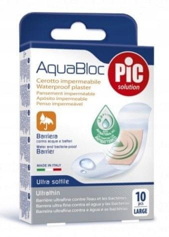 PIC AquaBloc vodoodporni antibakterijski obliž, velik, 10 kosov, 19 × 72 mm. Obliži Aquabloc so vodoodporni obliži iz zračnih materialov. Zagotavljajo odlično zaščito pred umazanijo in nečistočami. Lastnosti izdelka: Vodoodporni, ustvarjajo vodno zaporo in preprečujejo premočenje. Vsebuje klorheksidin z antibakterijskimi lastnostmi. Zaobljeni vogali dodatno zmanjšujejo tveganje za trganje. Popolnoma se oprimejo kože. Priporočljivo za različne vrste ureznin, ki so izpostavljene vodi. Različne oblike in velikosti omogočajo izbiro popolnega obliža glede na velikost rane. Ščiti pred umazanijo, kontaminacijo in vodo. Uporaba: Zasnovan za odrasle in otroke za zdravljenje manjših ureznin. Medicinski pripomoček – oznaka CE št.: 0373. Vključuje izjavo EU o skladnosti. Vključuje navodila za uporabo in vmesnik v poljščini. Vključuje nalepko v poljščini.