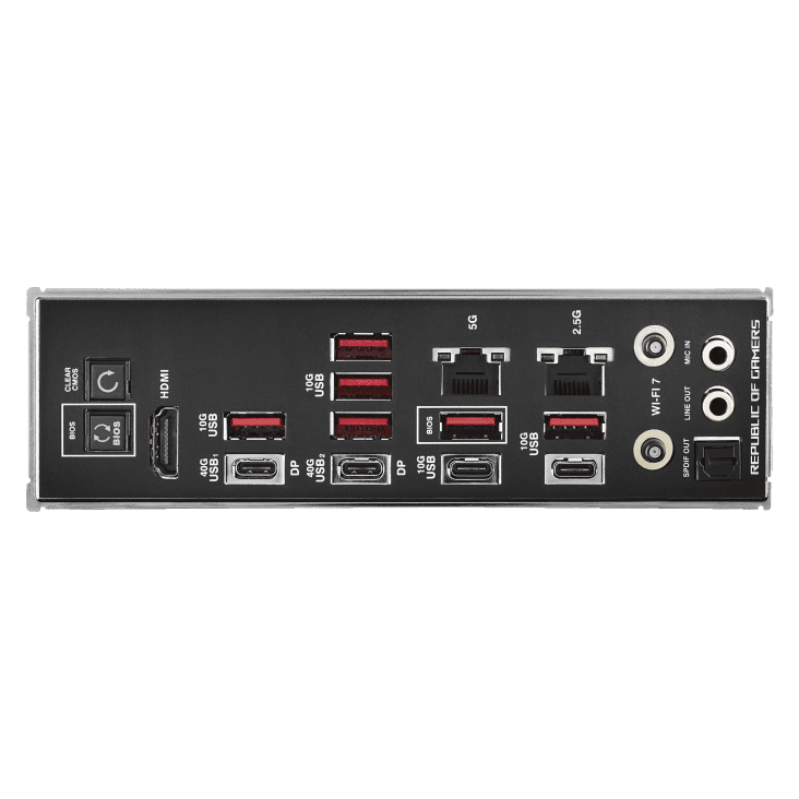 Nadgrajeni osvetlitveni modul Polymo Lighting II, ki krasi pokrov I/O, prinaša dinamično RGB osvetlitev z napredno grafiko, ki poudari logotip ROG ter dodatno poudari edinstveno estetiko te plošče.